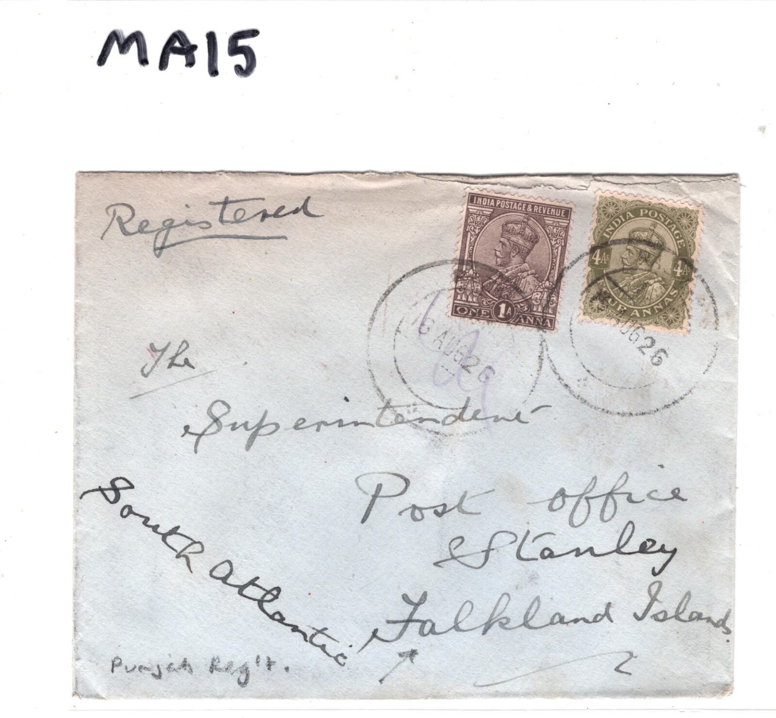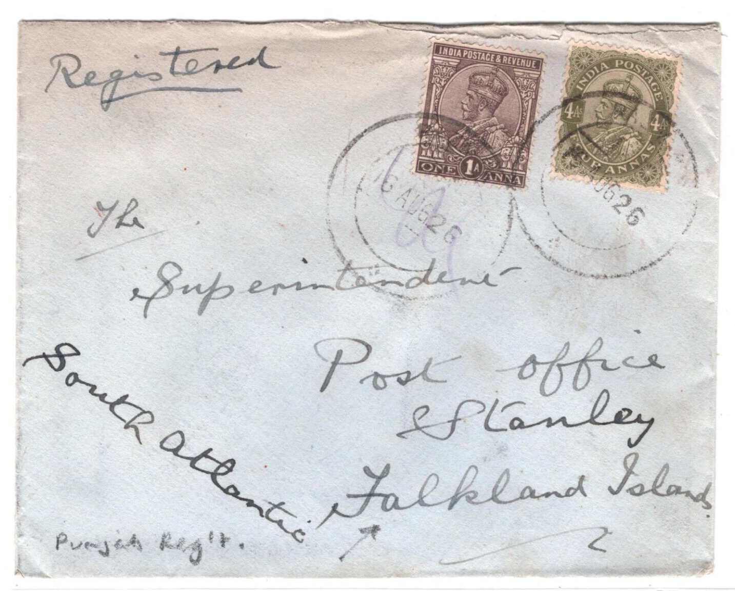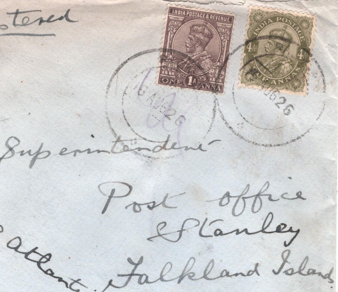 INDIA KGV FALKLAND ISLANDS MAIL Cover *PUNJAB REGIMENT* Razman? 1926 Reg'd MA15