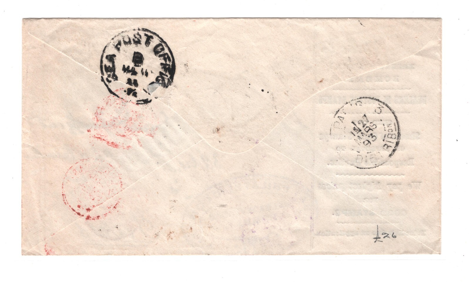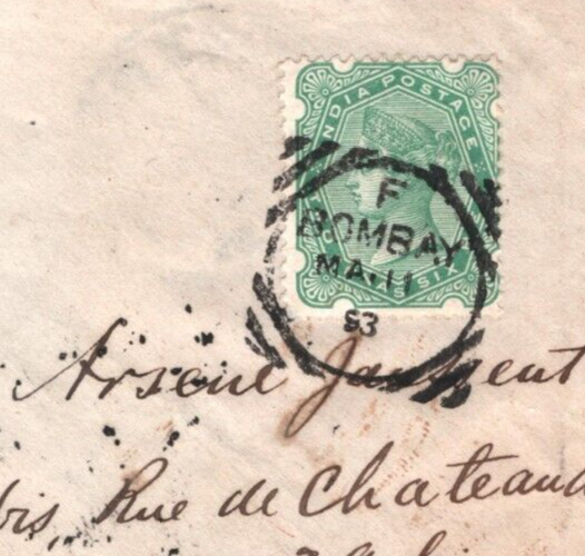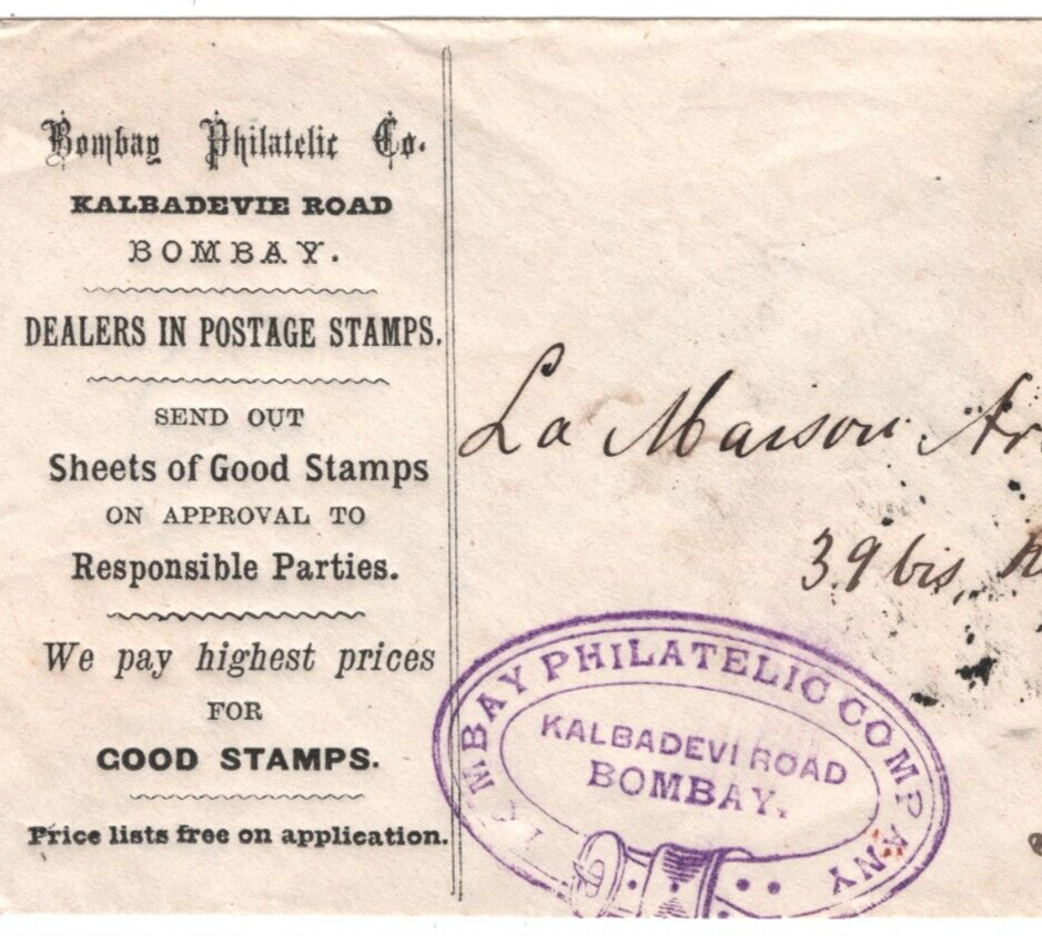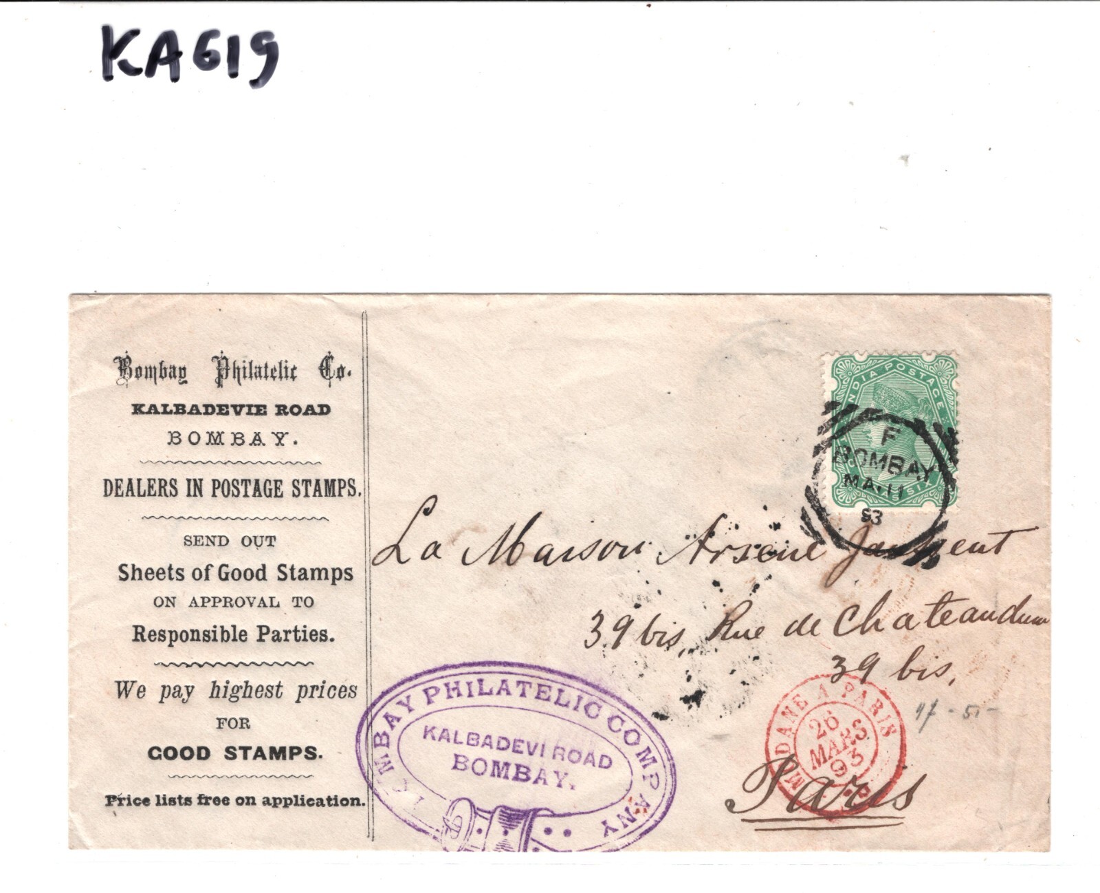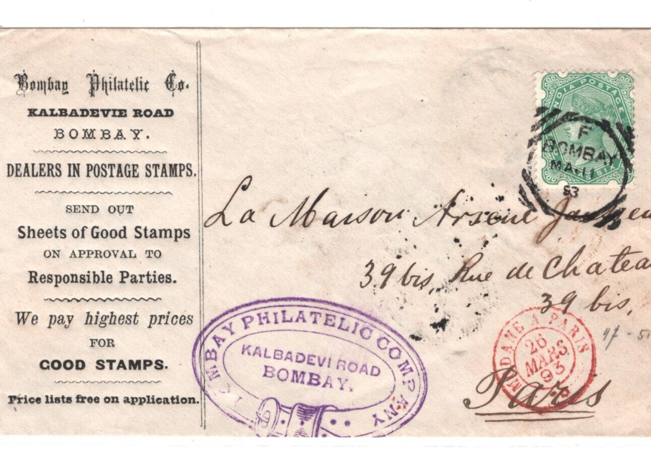 INDIA QV ADVERT Cover EARLY STAMP-DEALER *Bombay Philatelic Co* 1893 Paris KA619