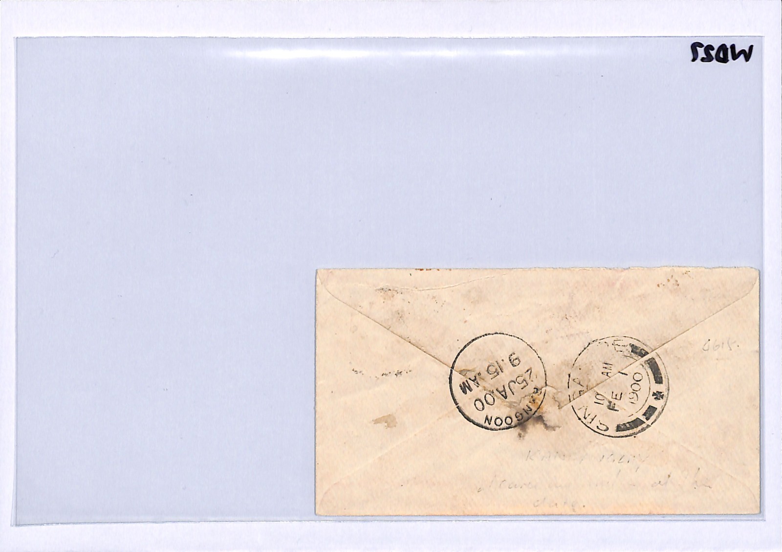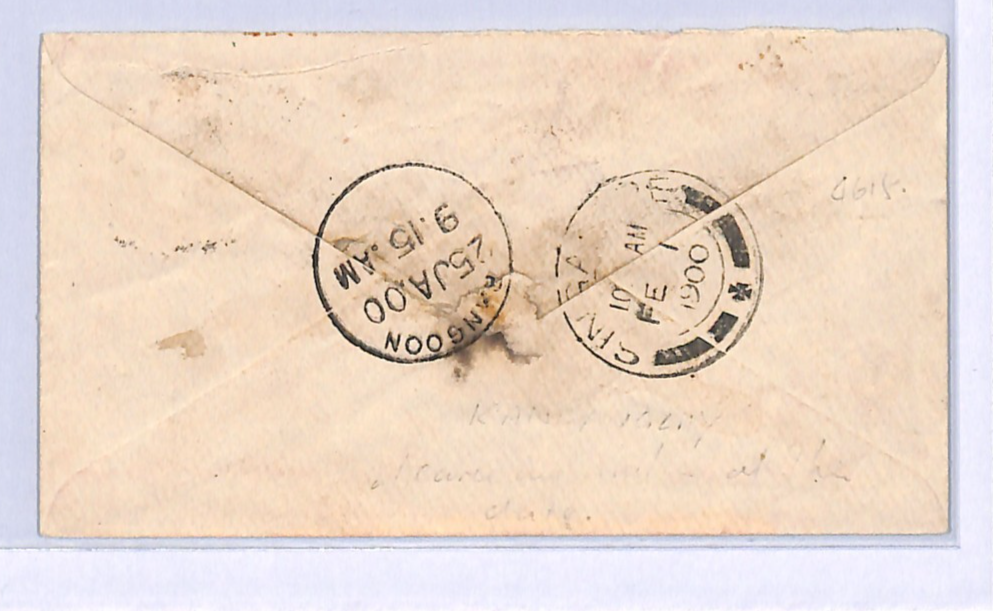 INDIA USED BURMA QV Cover Kandawgalay 1900 CDS *SINGAPORE MAIL* NGL Ship WD27