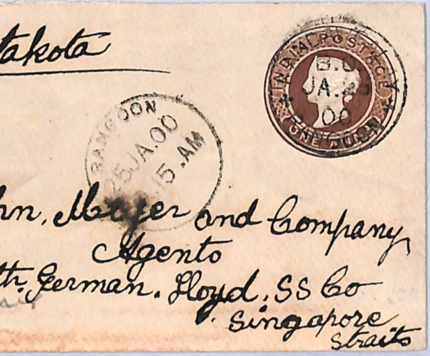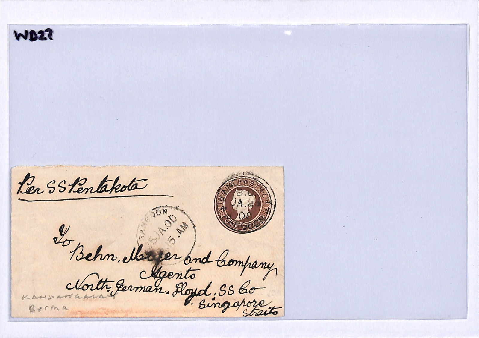 INDIA USED BURMA QV Stationery Cover Kandawgalay SINGAPORE 1900 Maritime SS Pentakota NORDDEUTSCHER LLOYD WD27