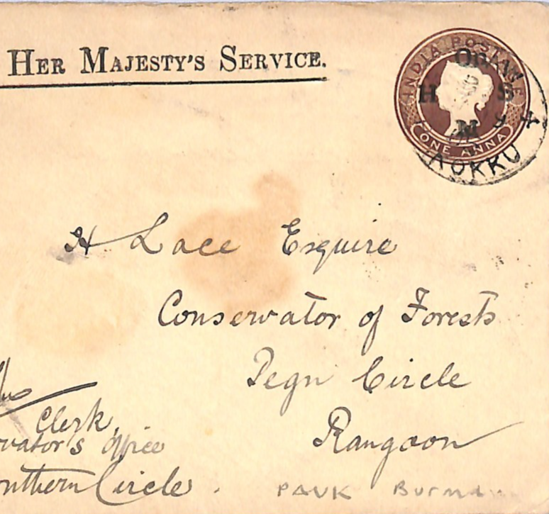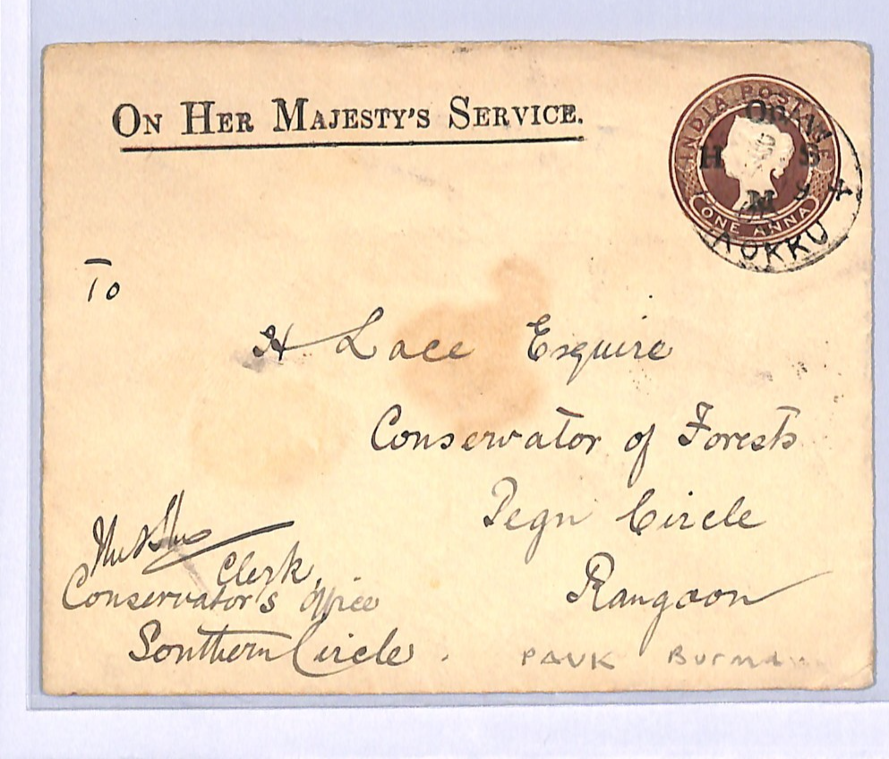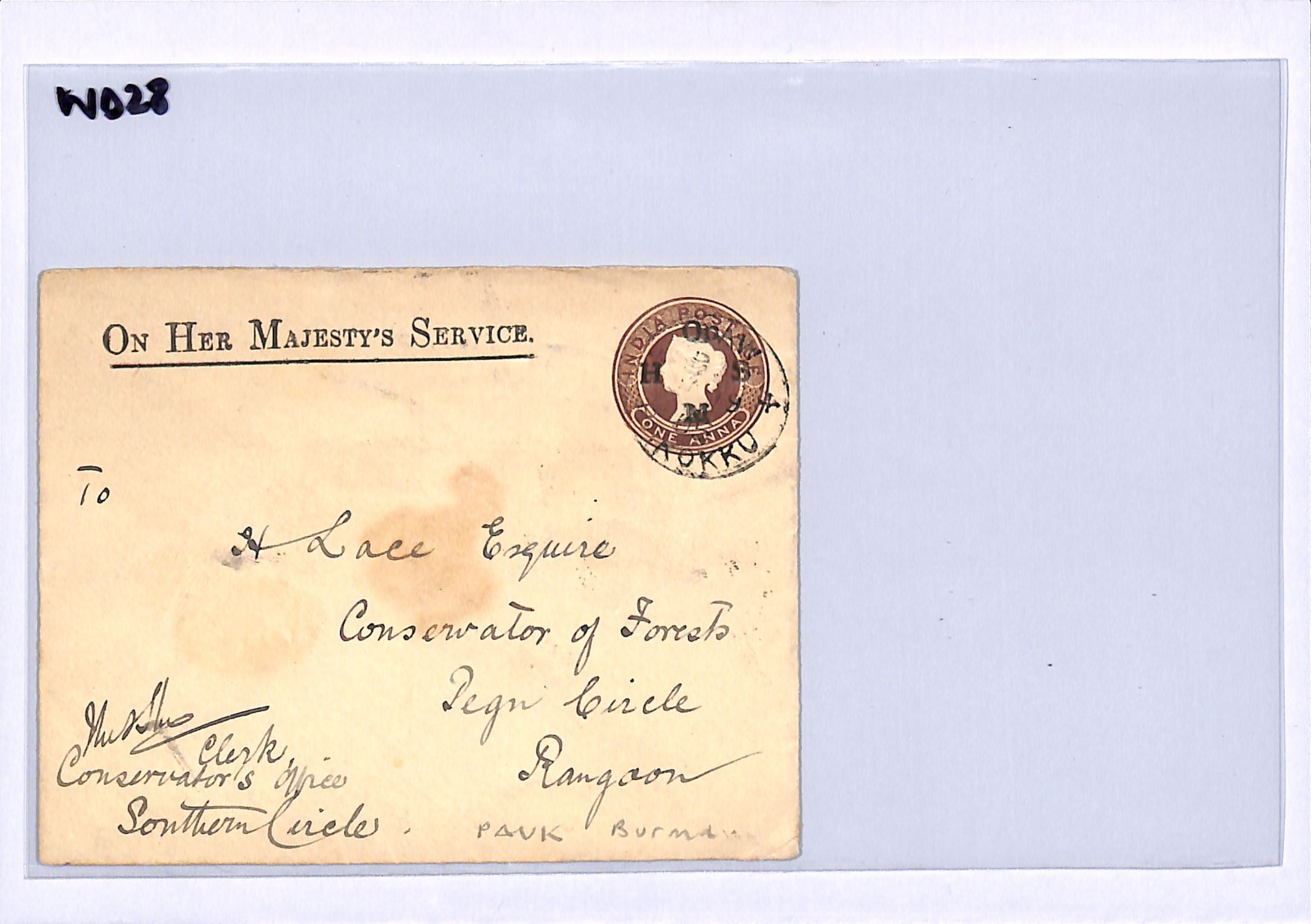 INDIA USED BURMA QV Stationery OHMS O/p Cover *PAUK* CONSERVATOR'S OFFICE WD28