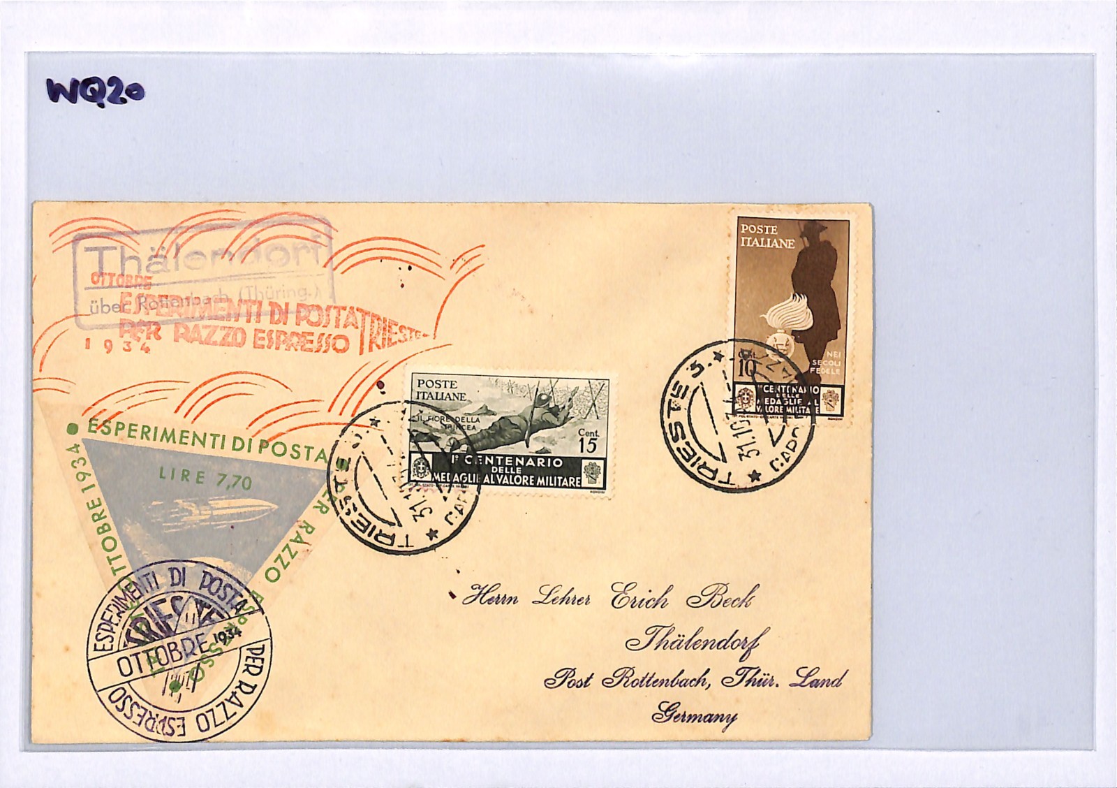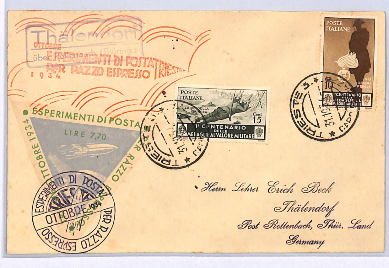 ITALY ROCKET MAIL Card 1934 RAZZO ESPRESSO Trieste Germany Thälendorf WQ20