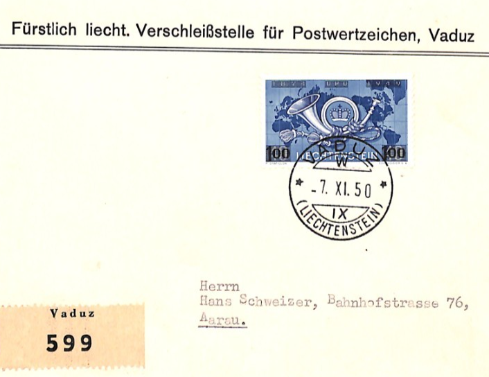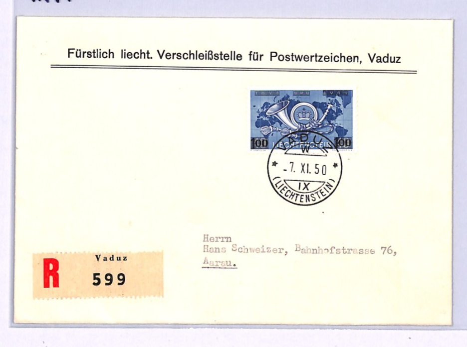 LIECHTENSTEIN 1950 FDC Cover *UPU* POSTHORN 100f Surcharge First Day Cover XV79
