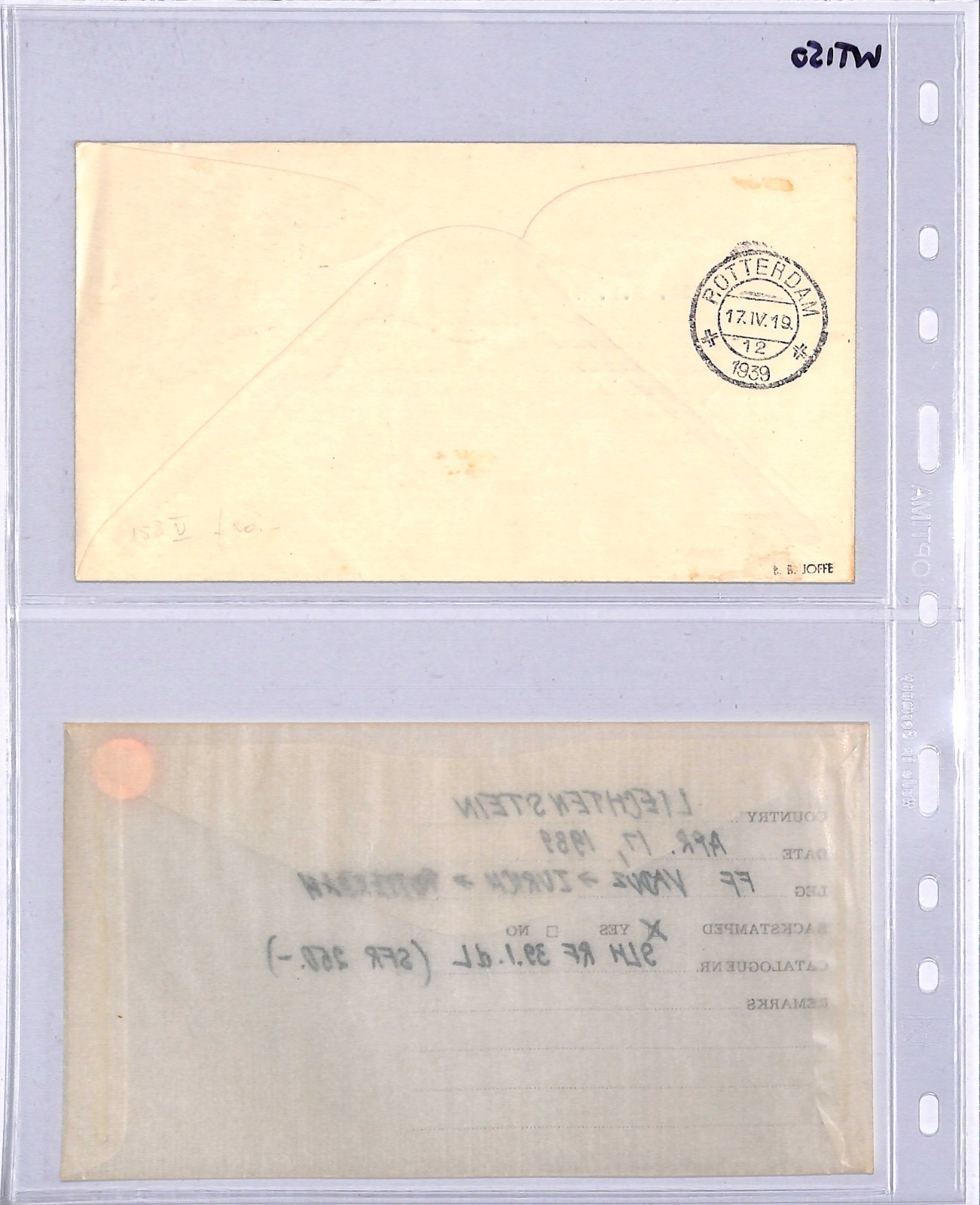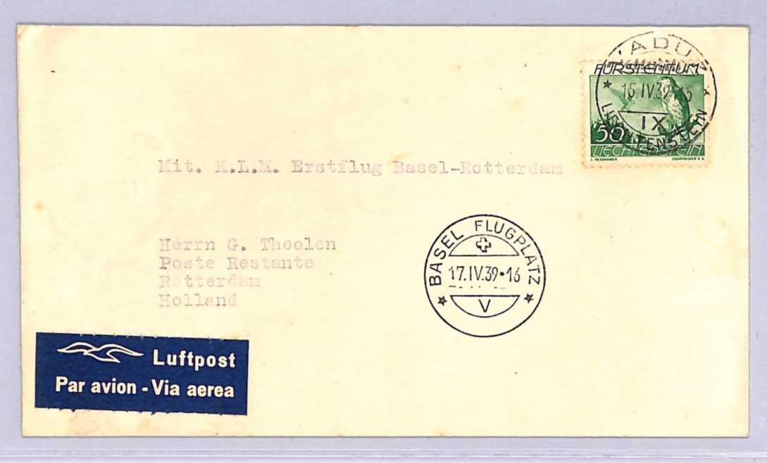 LIECHTENSTEIN Air Mail Cover KLM FIRST FLIGHT NETHERLANDS Amsterdam Zurich Switzerland 1939 WT150