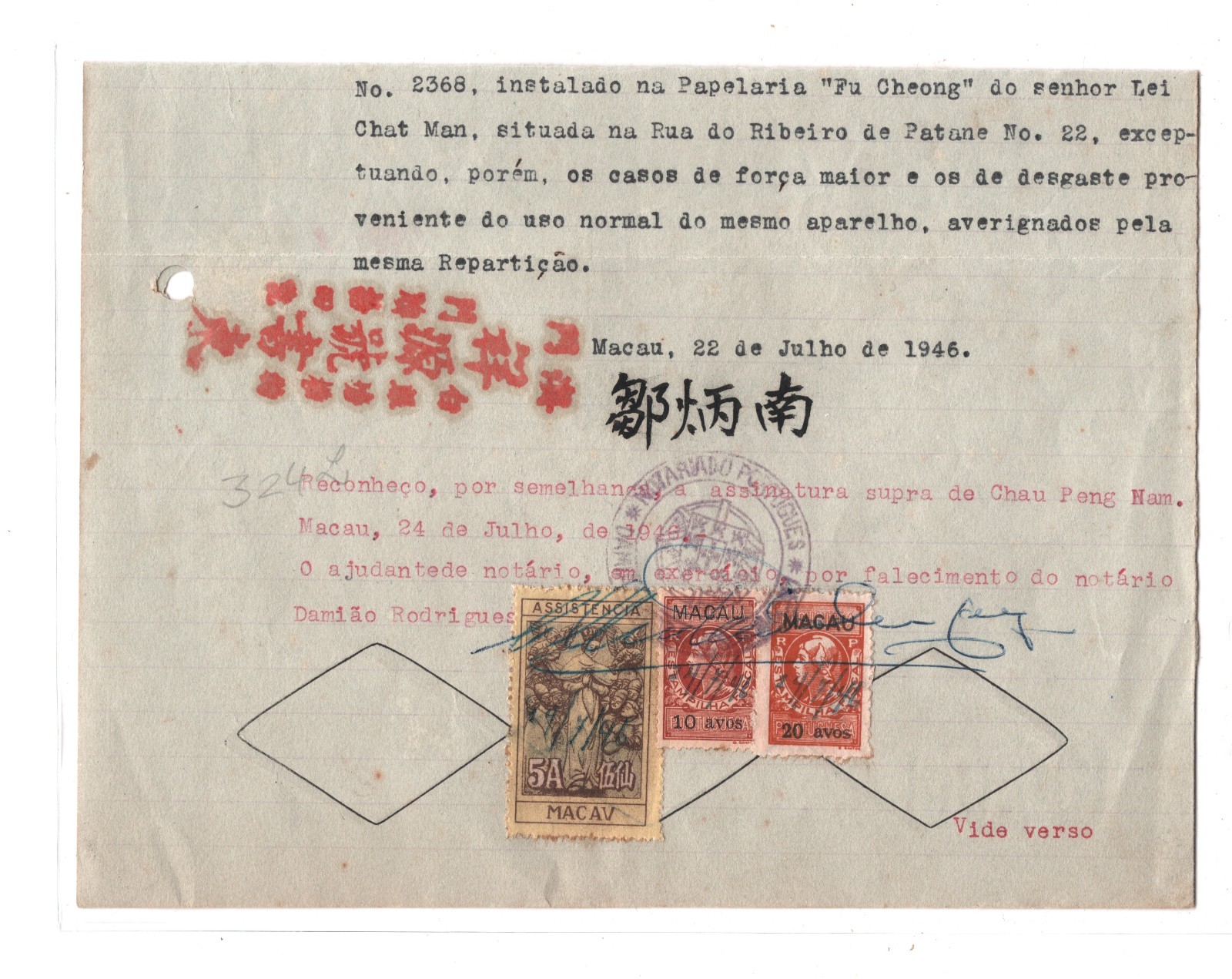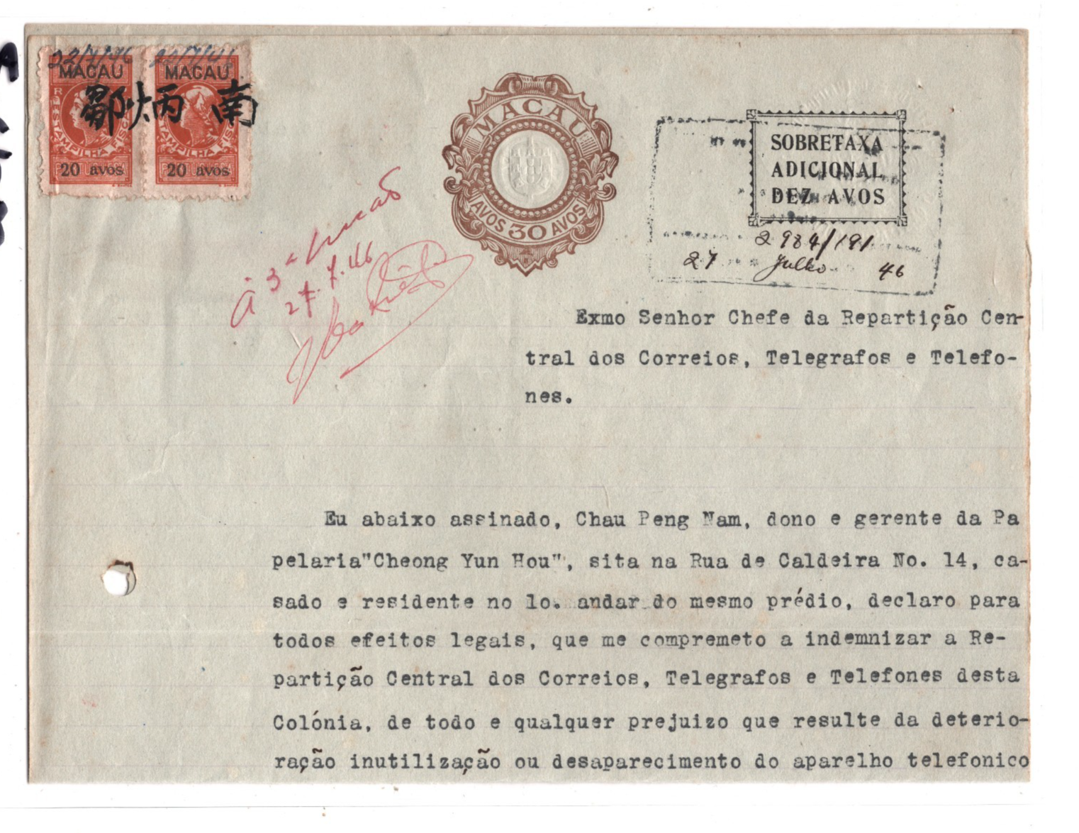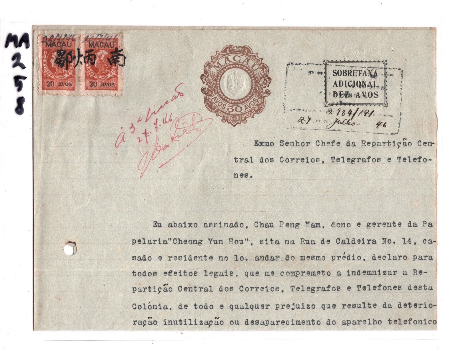 MACAU 30a Stationery Revenue 20a 10a 5a Document Phone 1946 CHINA/PORTUGAL MA258