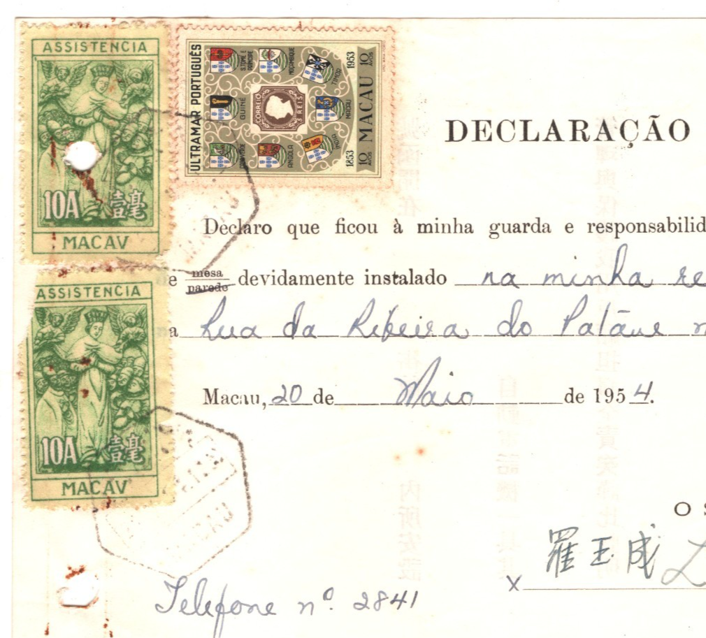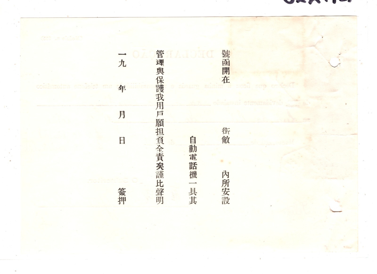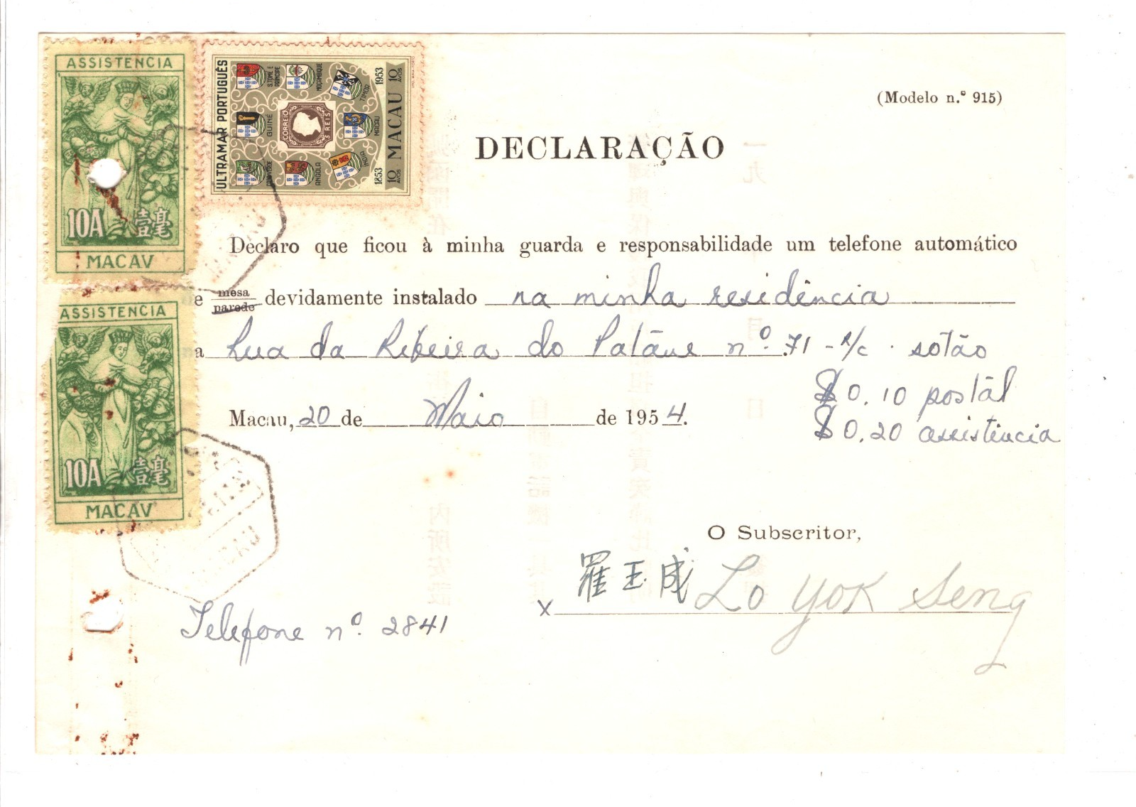 SCARCE USAGE. UNUSUAL MIXED FRANKING. Faults. HISTORICAL DOCUMENT relating to the INSTALLATION & RUNNING OF TELEPHONES in Macau. Overall Good/VG for an item of this type & period. Please look at all the scans to help form your own opinion (WAF).
