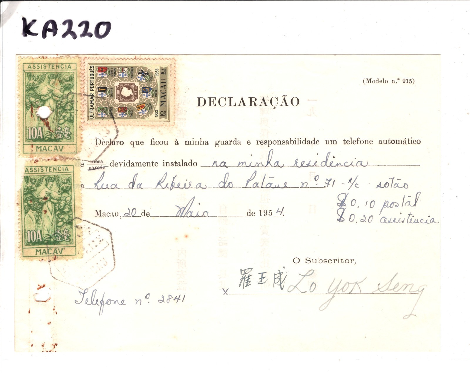 MACAU Document 10a Pair Revenue 10a Postage Telephone 1954 CHINA/PORTUGAL KA220