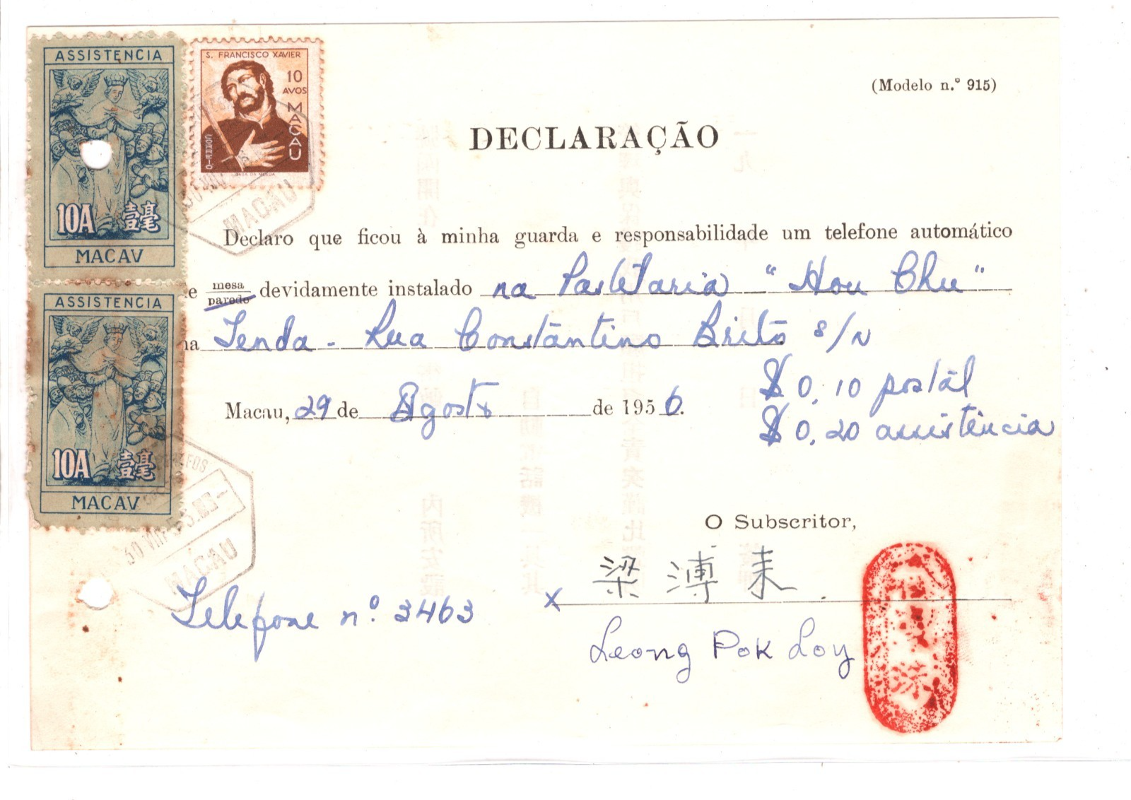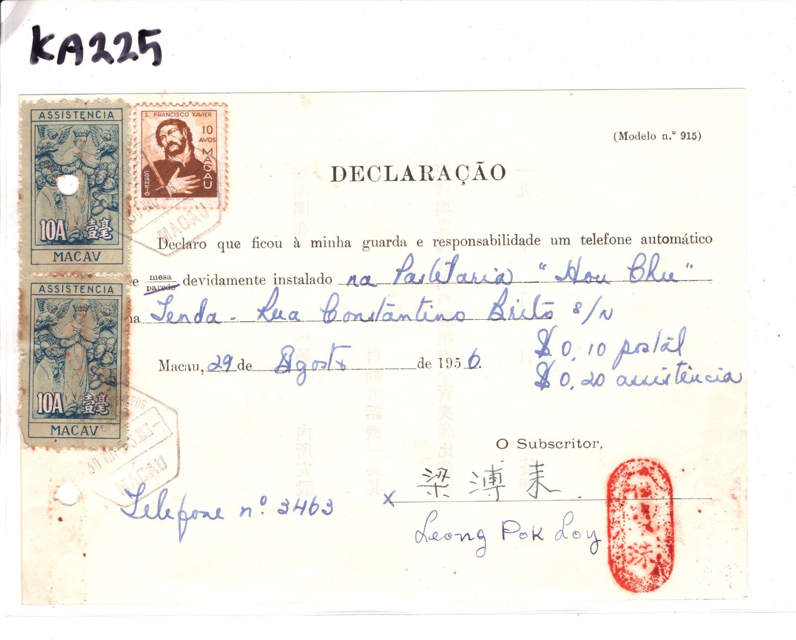 MACAU Document 10a Pair Revenue 10a Postage Telephone 1956 CHINA/PORTUGAL KA225