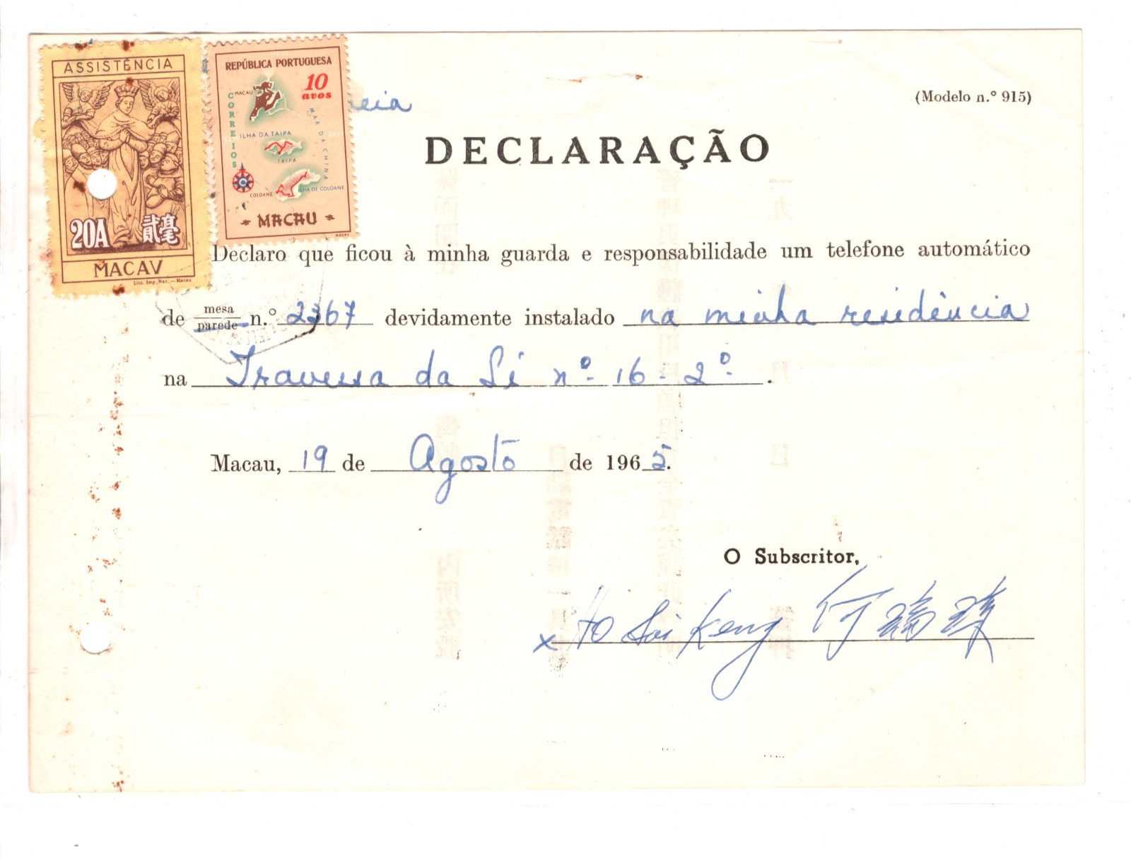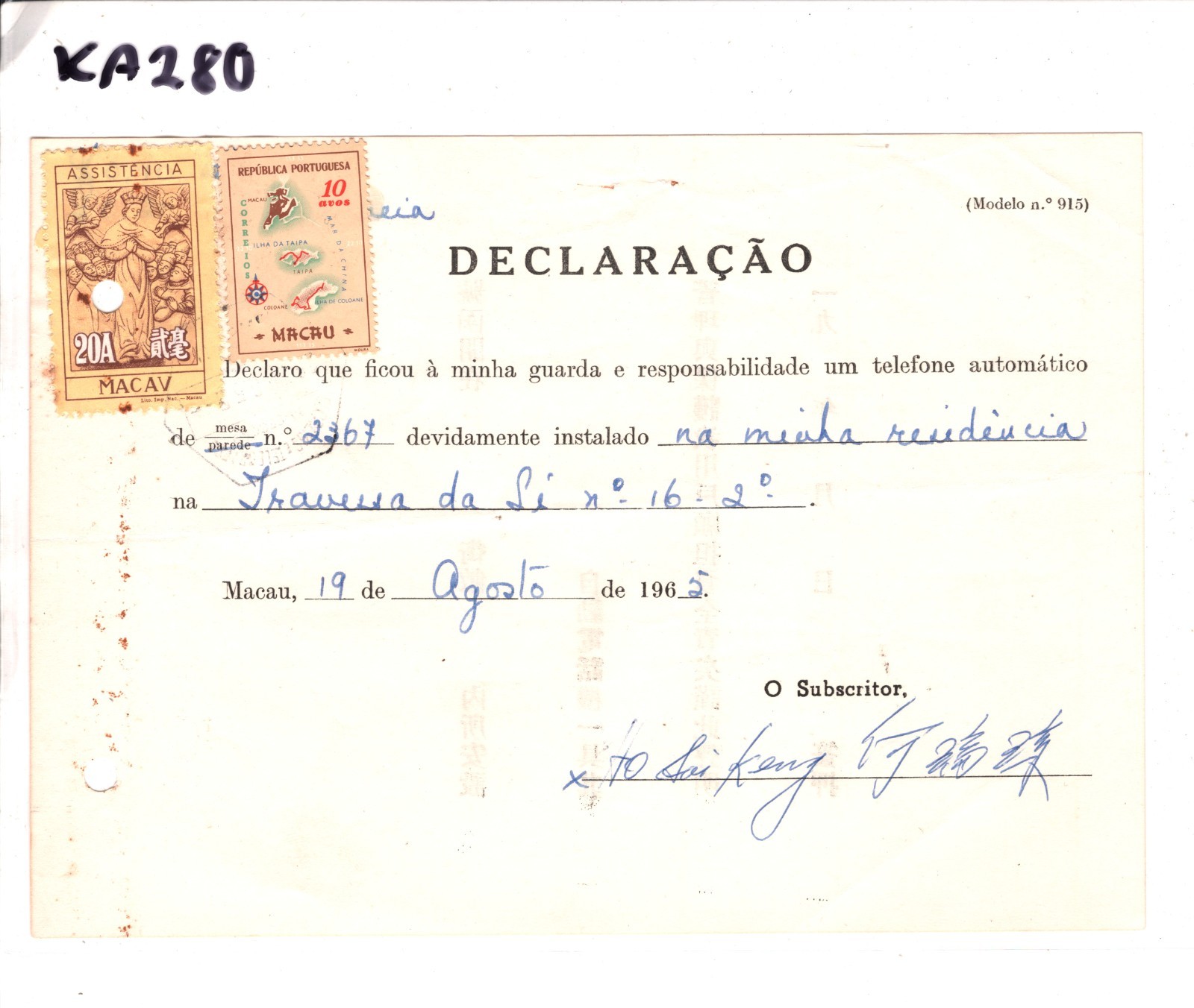 MACAU Document 20a Revenue 10a Postage Telephone 1965 CHINA/PORTUGAL KA280