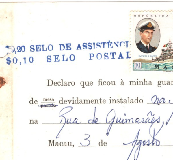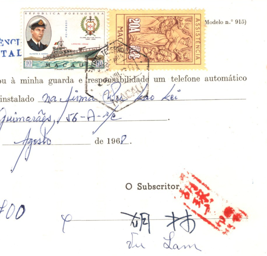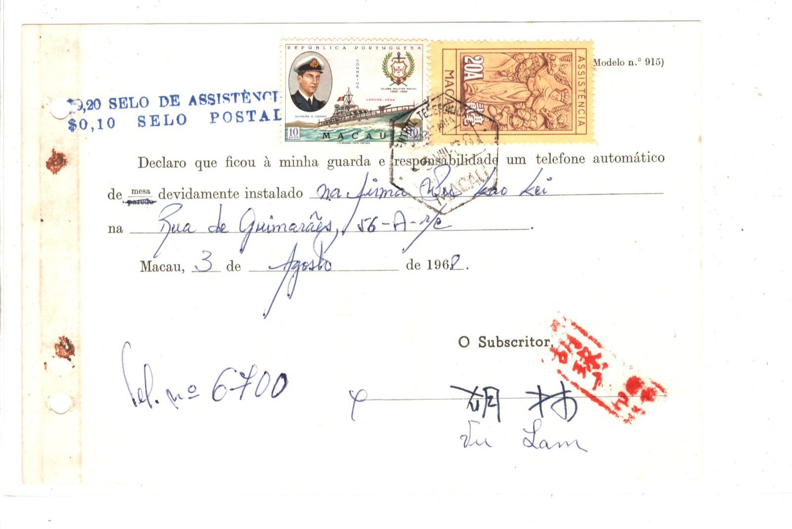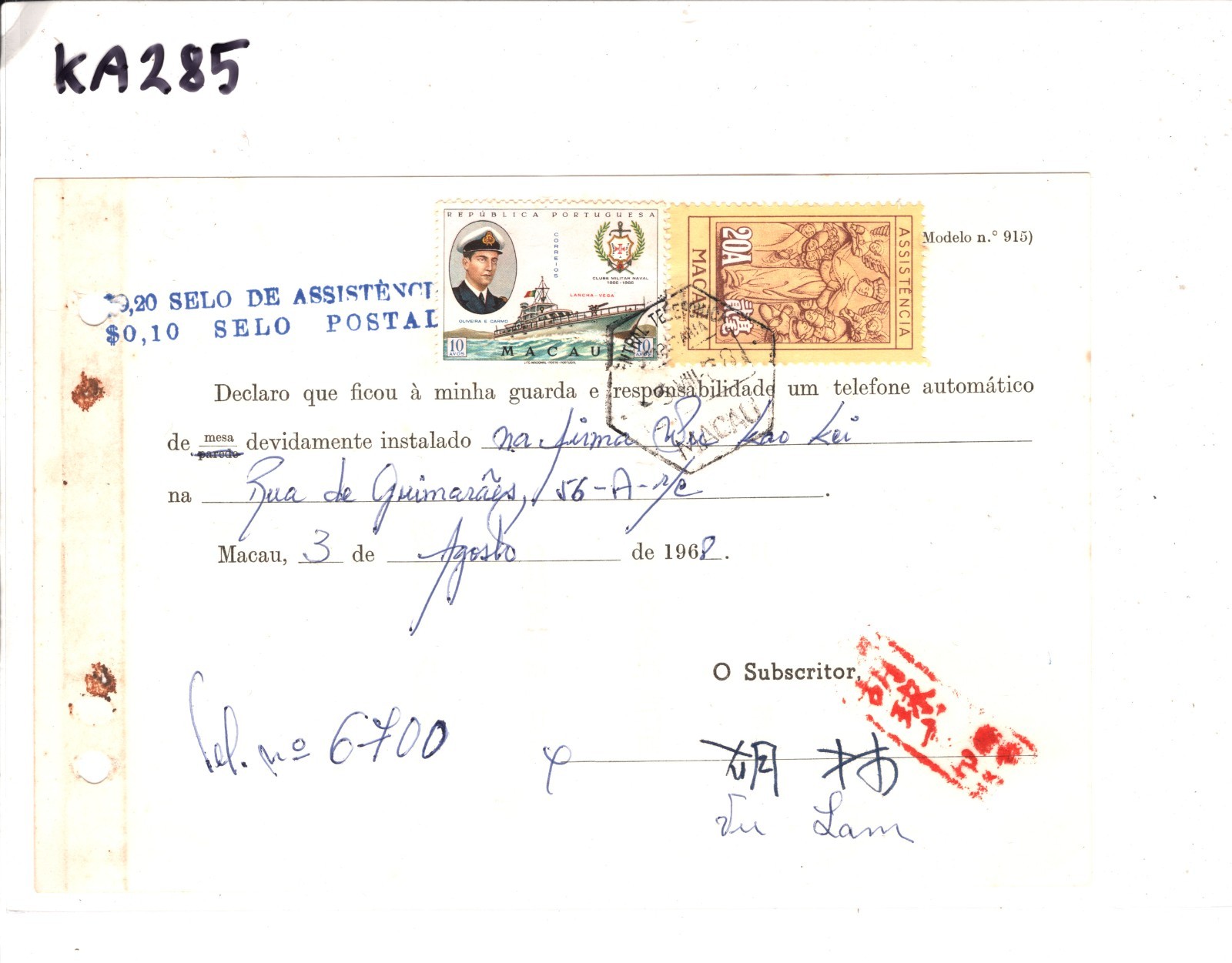 MACAU Document 20a Revenue 10a SHIP Postage Telephone 1968 CHINA/PORTUGAL KA285