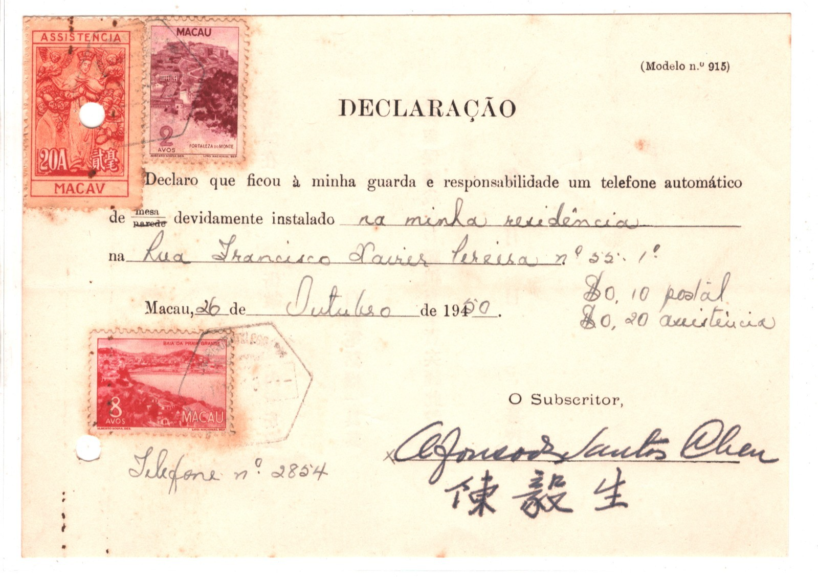 VERY SCARCE ITEM. UNUSUAL USAGE of Postage Stamps in FISCAL MIXED FRANKING. Some faults. HISTORICAL DOCUMENT relating to the INSTALLATION & RUNNING OF TELEPHONES in Macau. Overall Good/Very Good for an item of this type & period. Please look at all the scans to help form your own opinion (WAF).