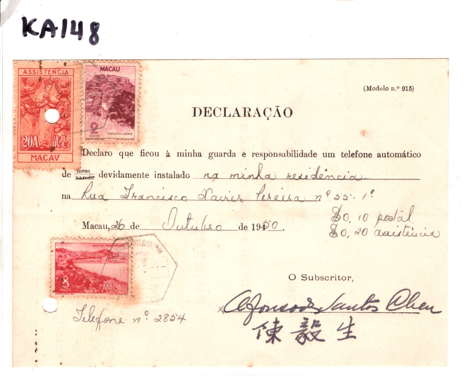 MACAU Document 20a Revenue 2a & 8a Postage Telephone 1950 CHINA/PORTUGAL KA148