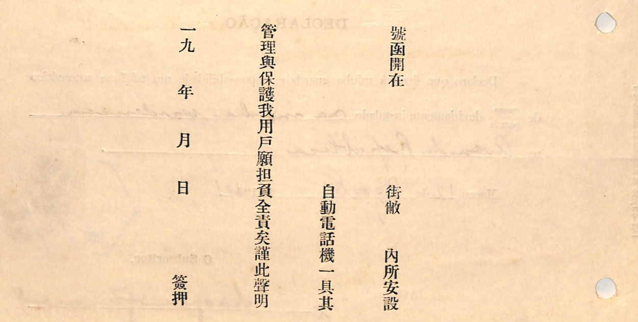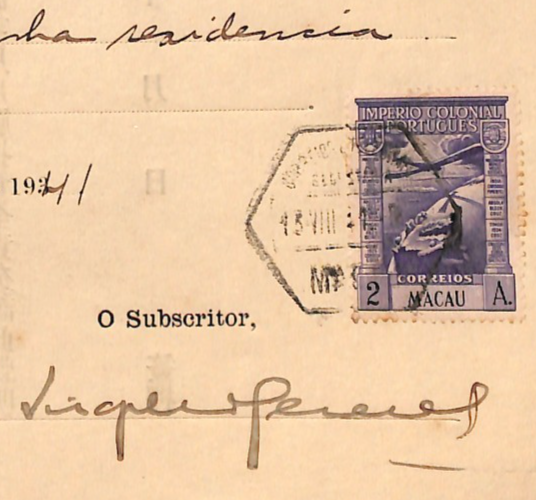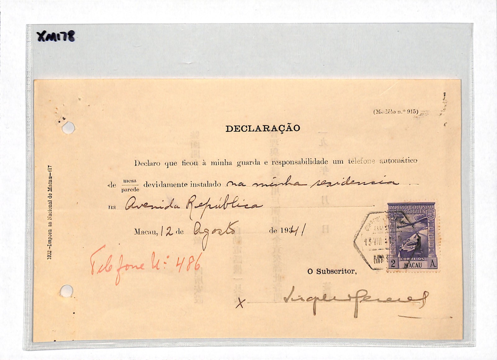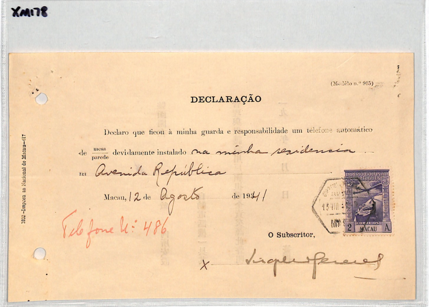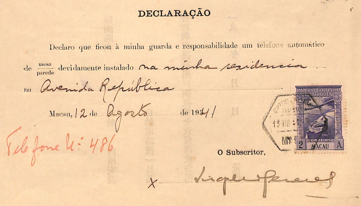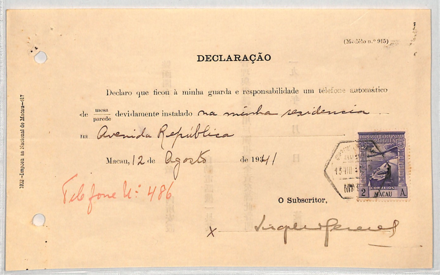 MOST UNUSUAL FISCAL USAGE of *AIR MAIL* Postage Stamp. HISTORICAL DOCUMENT relating to the INSTALLATION & RUNNING OF TELEPHONES in Macau. Overall Very Fine for an item of this type & period. Please look at all the scans to help form your own opinion (WAF).