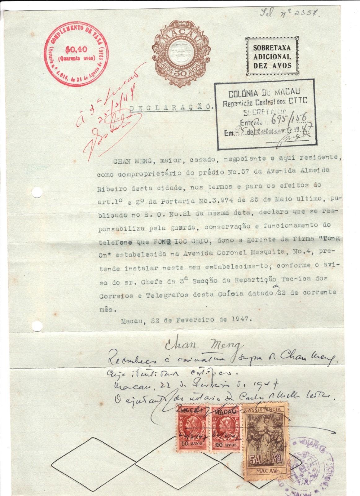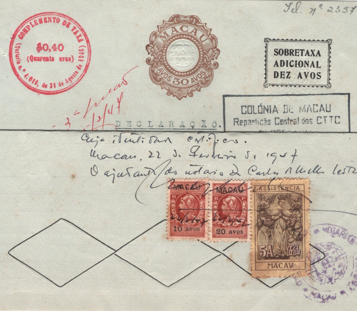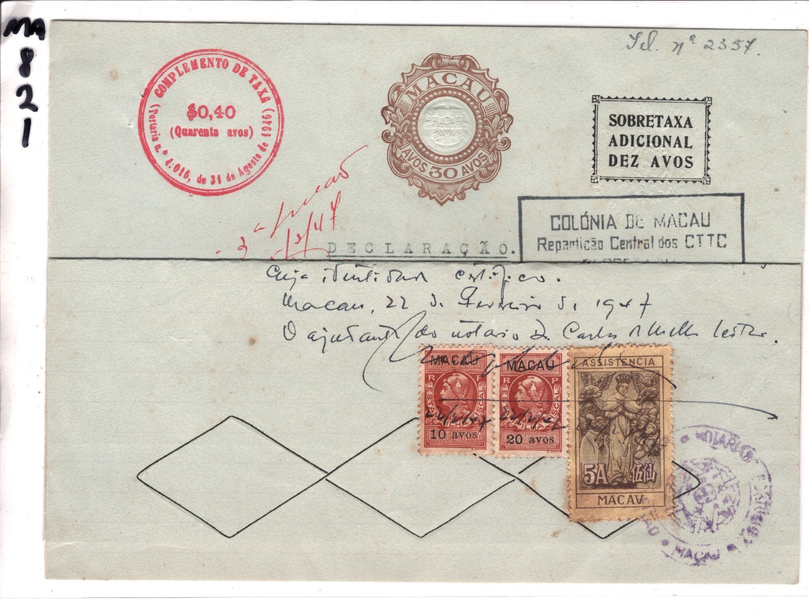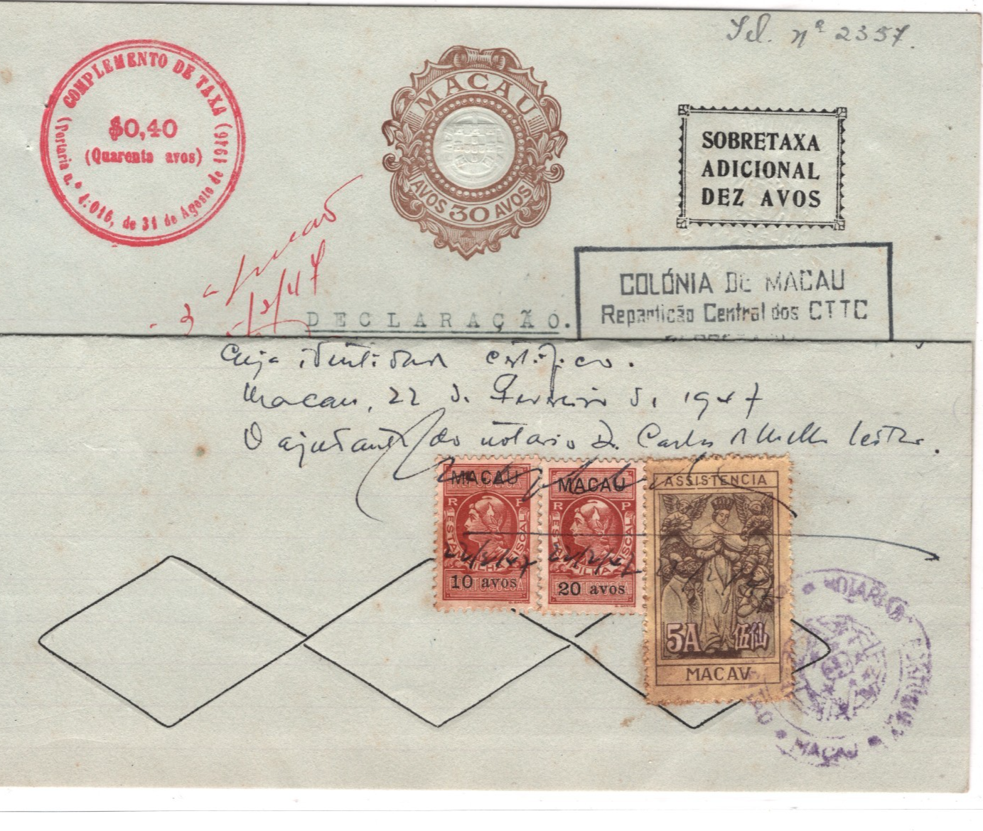 MACAU Document 30a Stationery 5a Revenue 20a & 10a Fiscal 1947 CHINA MA821
