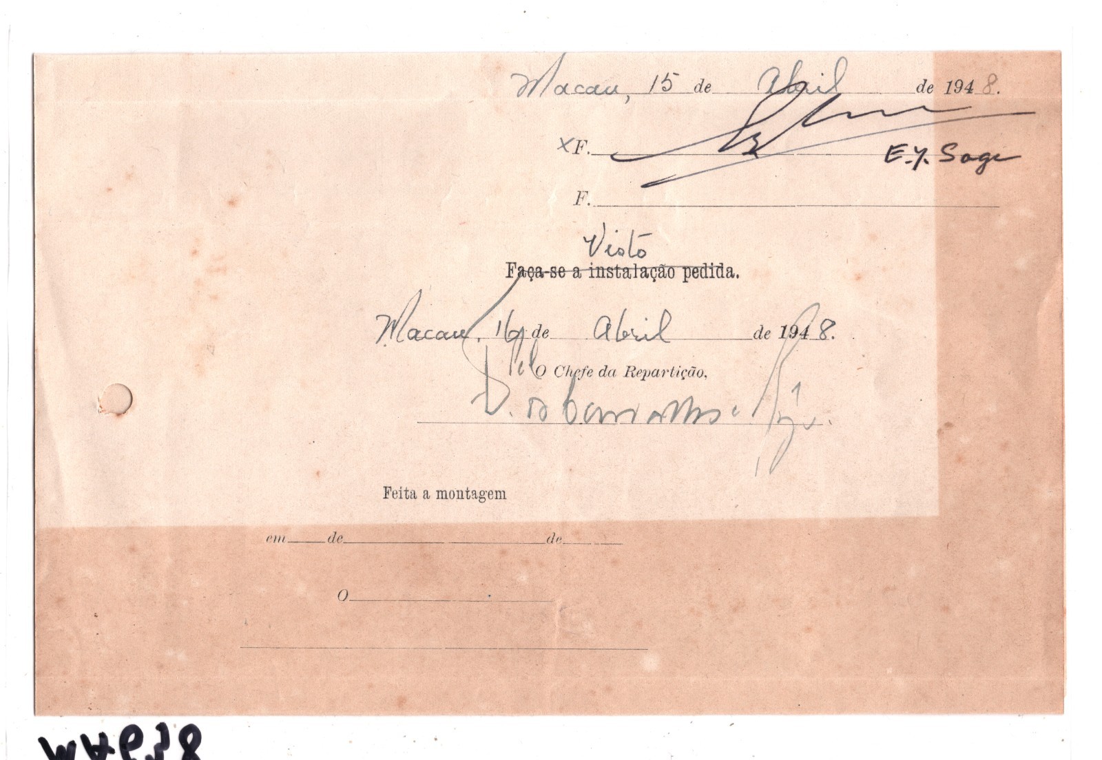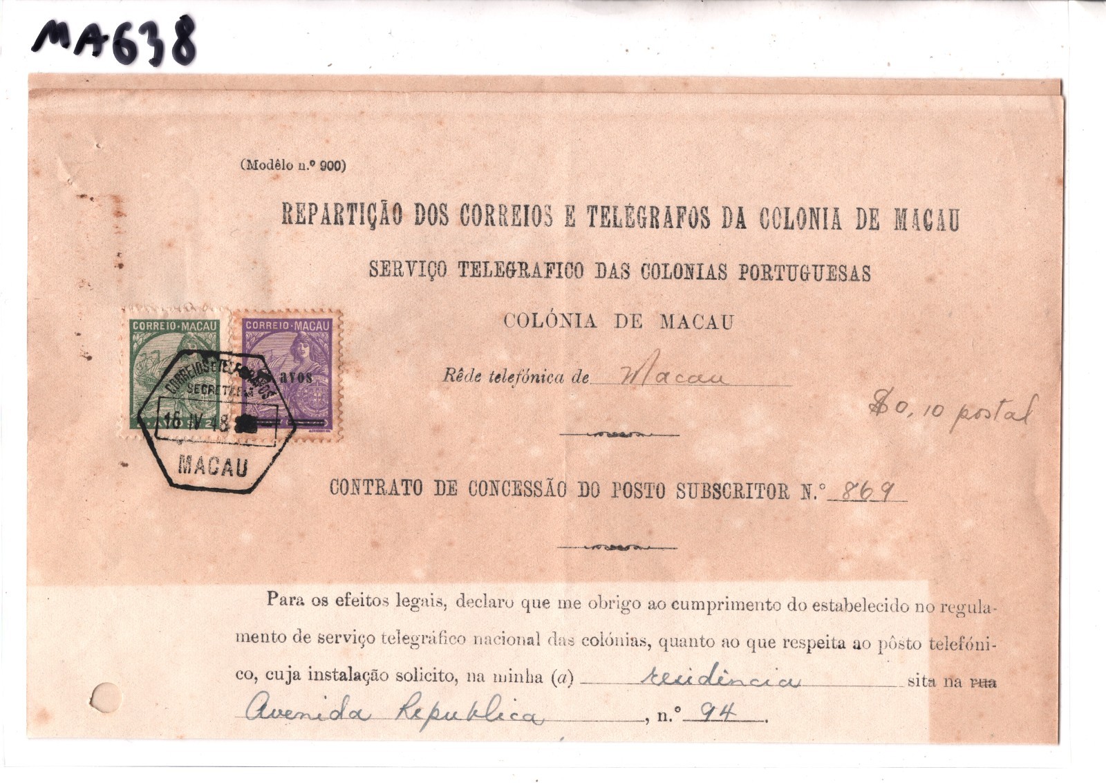 SCARCE USAGE. Slight faults. HISTORICAL DOCUMENT relating to the INSTALLATION & RUNNING OF TELEPHONES in Macau. Overall Very Good/Fine for an item of this type & period. Please look at all the scans to help form your own opinion (WAF).