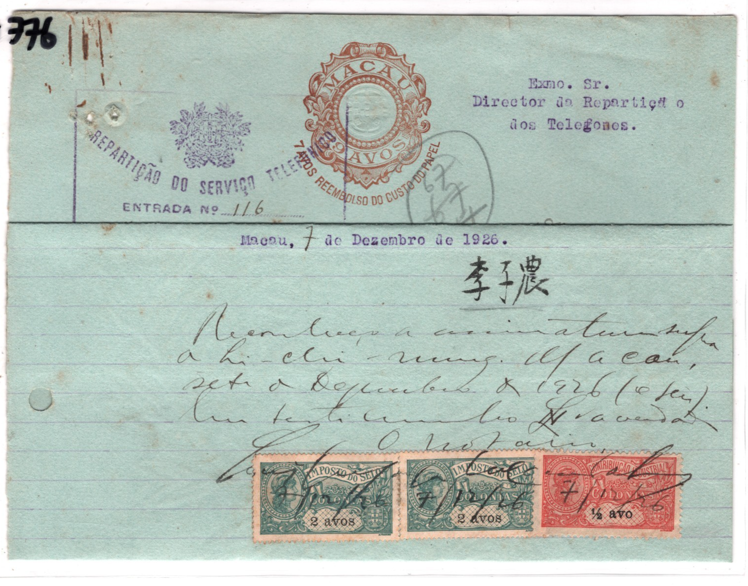 MACAU Stationery 19a Document 2a ½a Revenue Phone 1926 CHINA/PORTUGAL MA776
