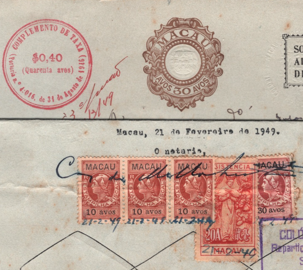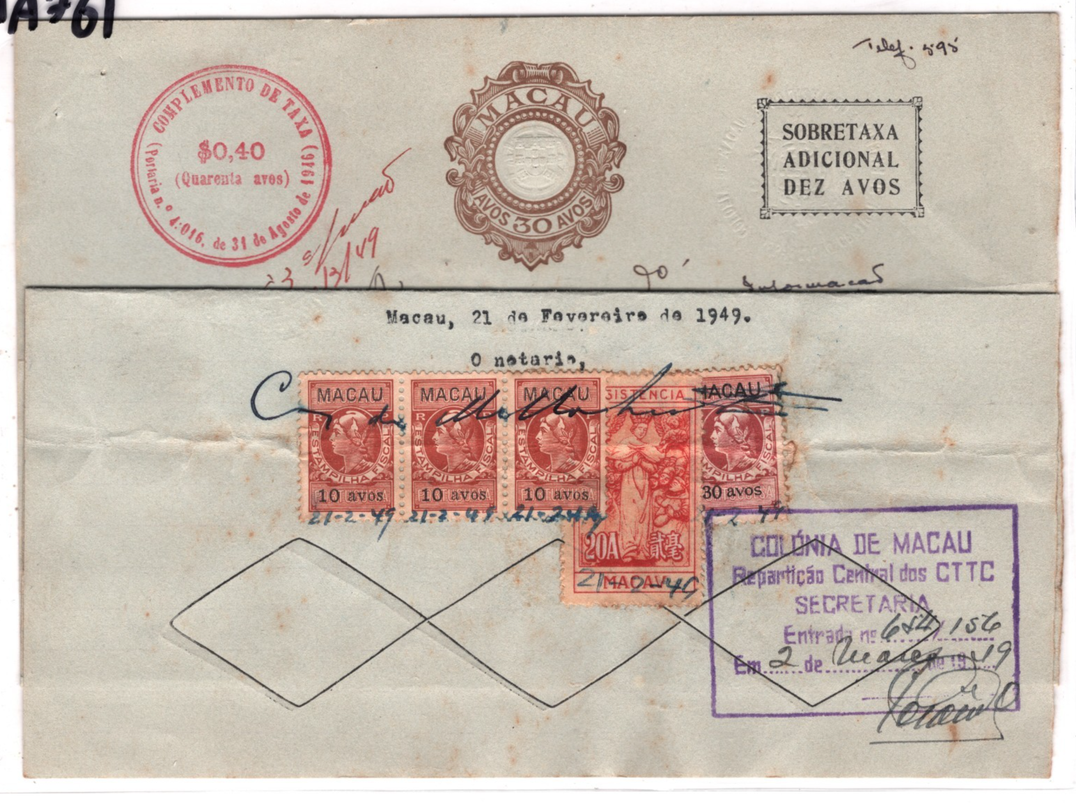 MACAU Stationery 30a Document 30a 20a Revenue Phone 1949 CHINA/PORTUGAL MA761