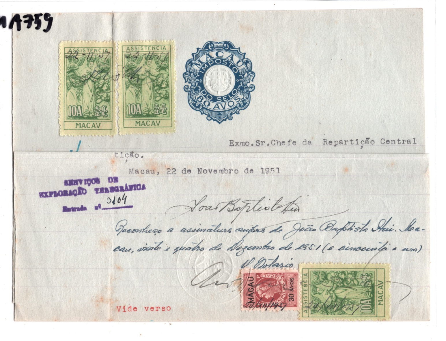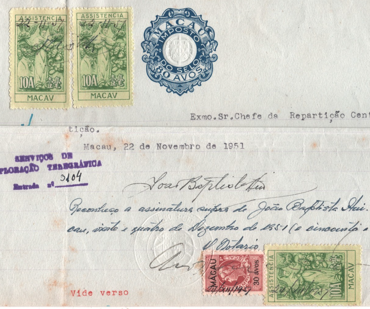 MACAU Stationery 80a Document 30a 10a{3} Revenue Phone 1951 CHINA/PORTUGAL MA759