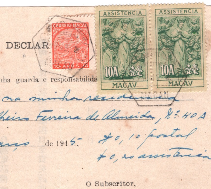 VERY SCARCE *WARTIME* ITEM. Note MIXED FRANKING OF POSTAGE & REVENUE STAMPS with all stamps free of filing holes or faults. HISTORICAL DOCUMENT relating to the INSTALLATION & RUNNING OF TELEPHONES in Macau. Overall Very Fine for an item of this type & period. Please look at all the scans to help form your own opinion (WAF).