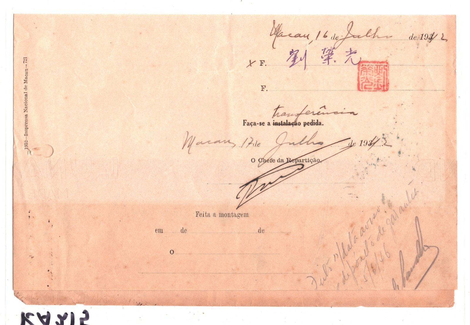 VERY SCARCE *SURCHARGE* POSTAGE STAMP FRANKING. Unusual fiscal usage.  Original full document with inconsistent toning, folded to scanned size. Will open out for display.  WARTIME USAGE with typical inconsistent tones. Note stamps are VERY FINE and free of filing holes. HISTORICAL DOCUMENT relating to the INSTALLATION & RUNNING OF TELEPHONES in Macau. Overall Very Good for an item of this type & period. Please look at all the scans to help form your own opinion (WAF).