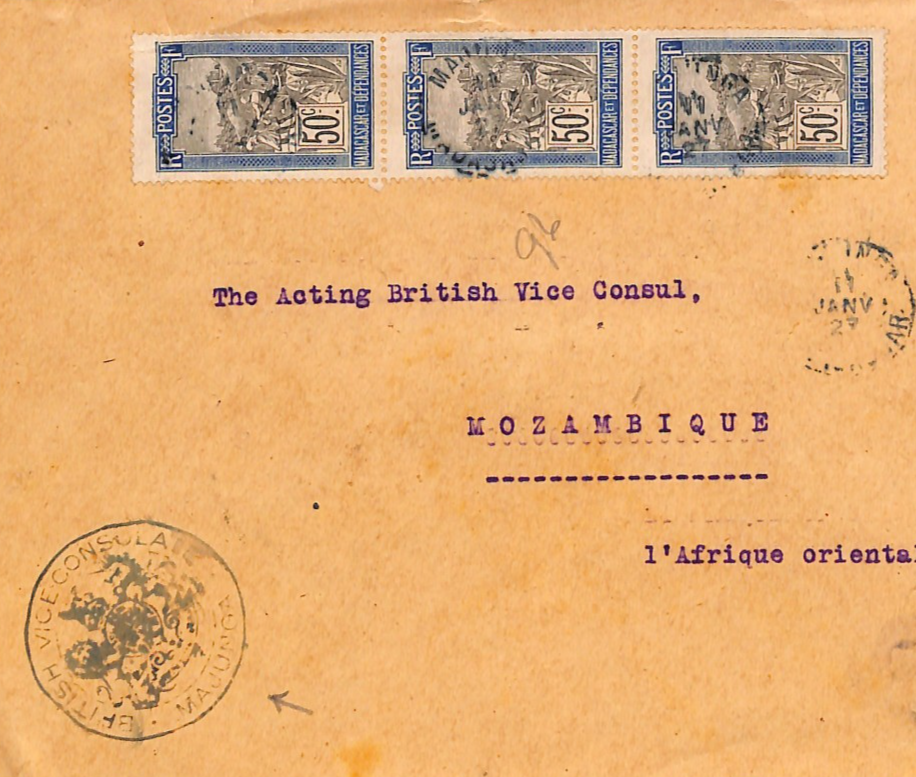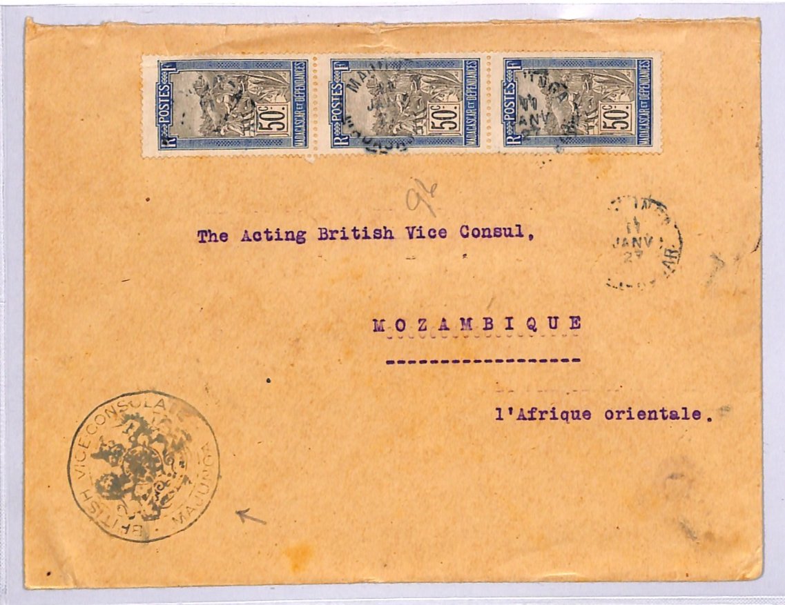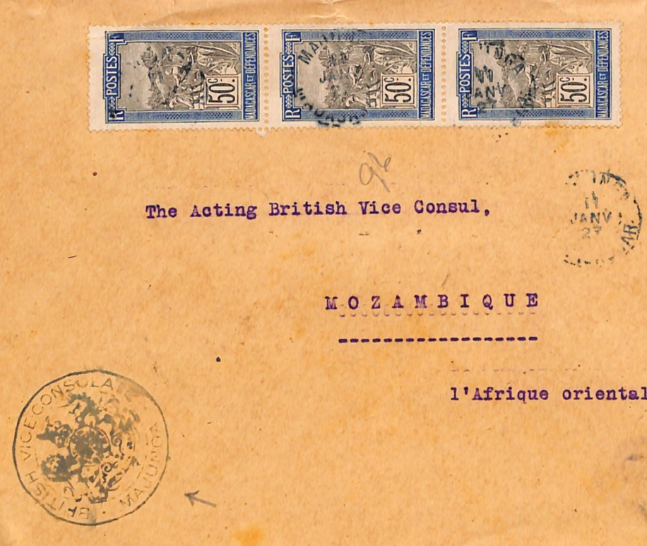 MADAGASCAR/MOZAMBIQUE Cover 1927 Forwarded *BRITISH VICE CONSULATE MAJUNGA* Porto Amélia NYASSA Hex ReverseWB231