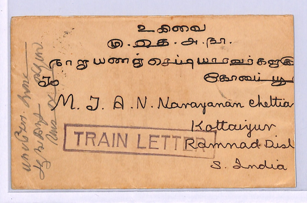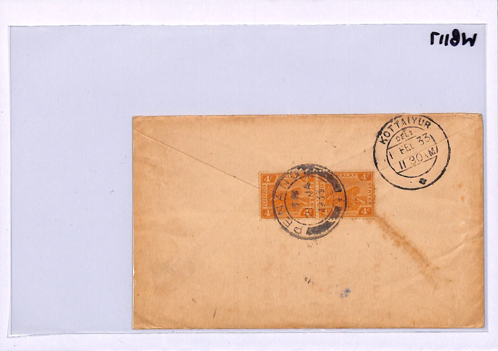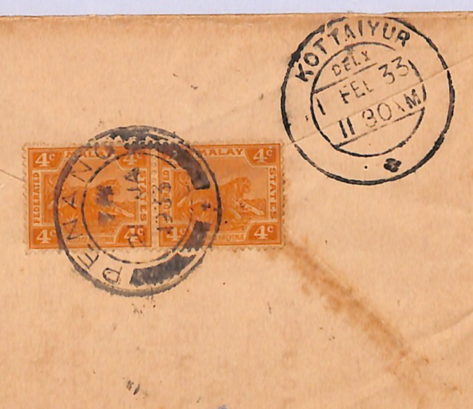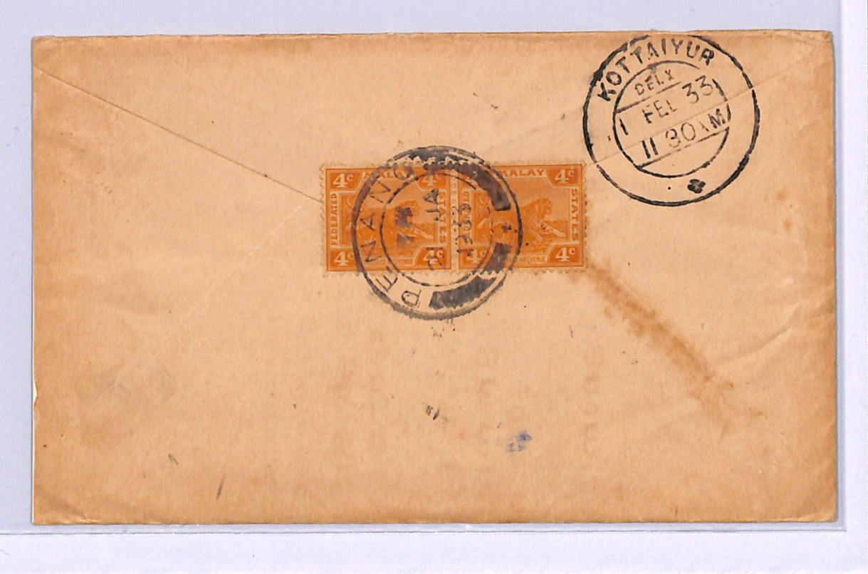 MALAYA FMS TIGERS USED PENANG Cover India Kottaiyur TRAIN LETTER 1933 WB117