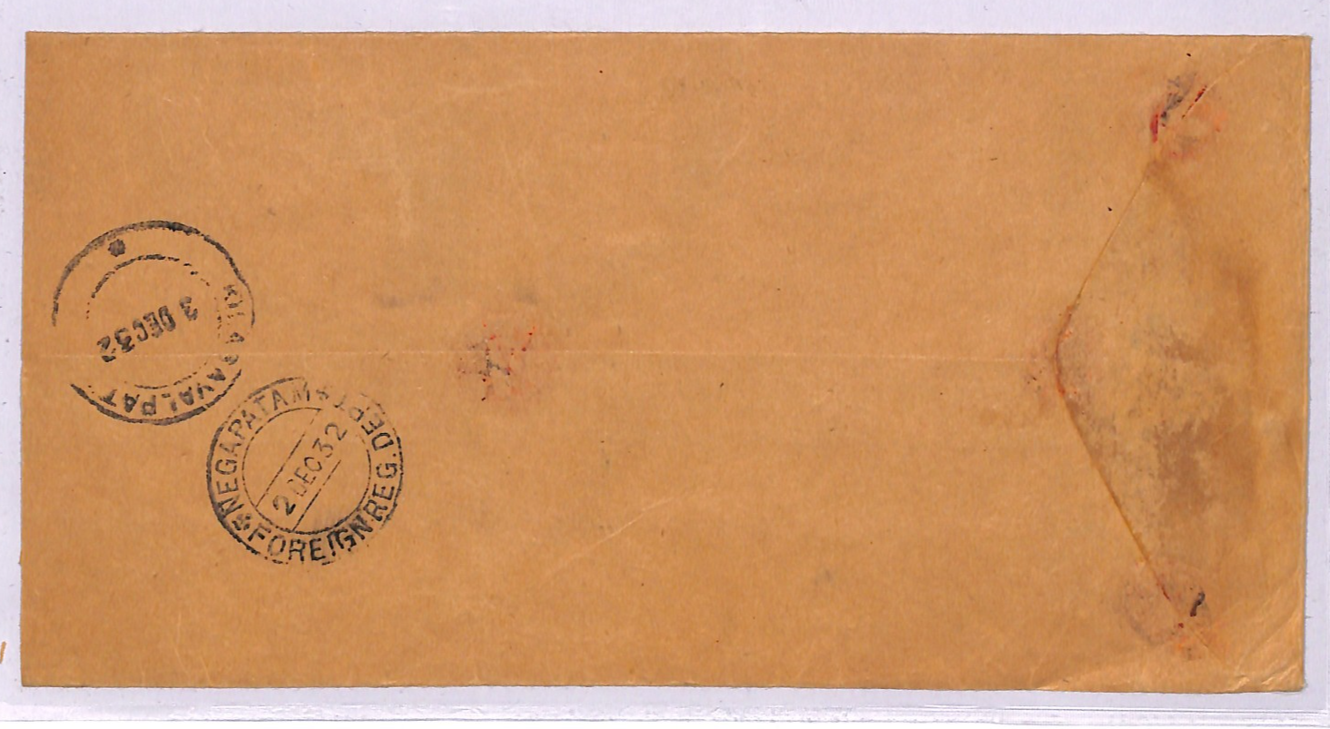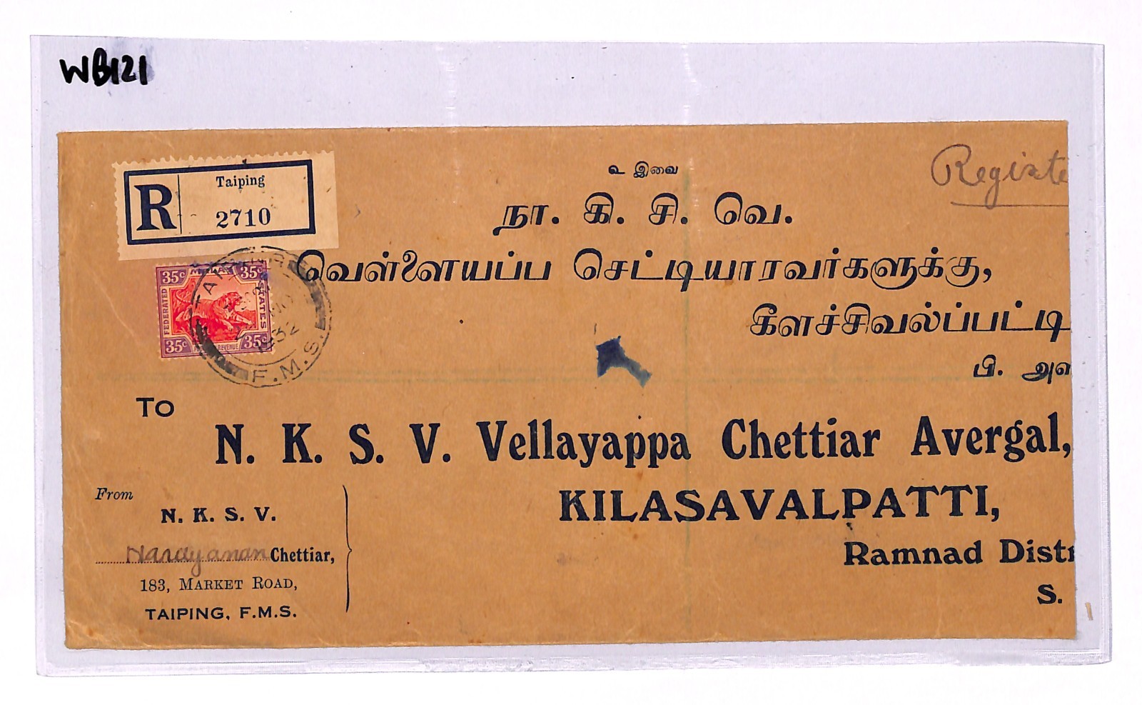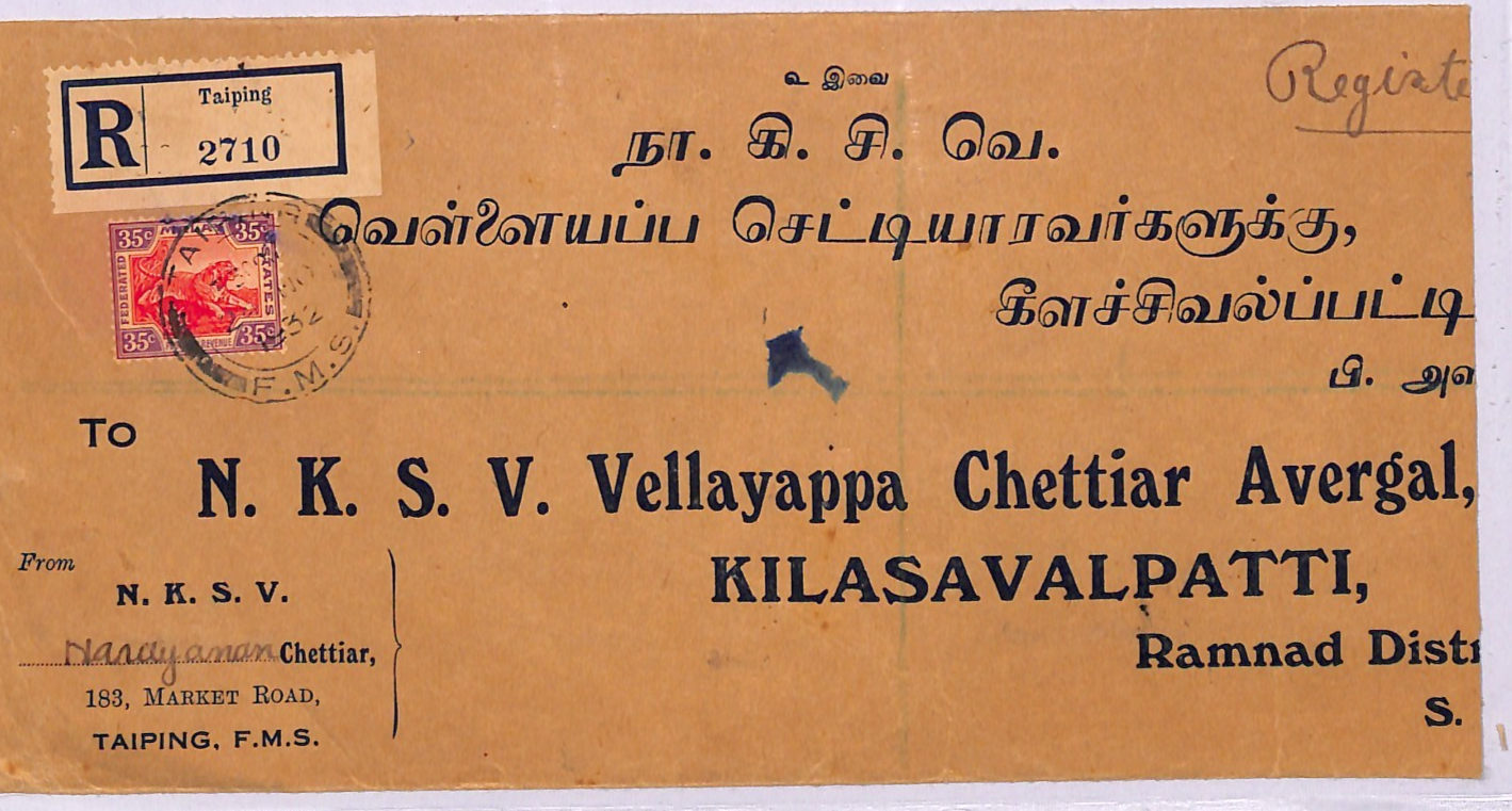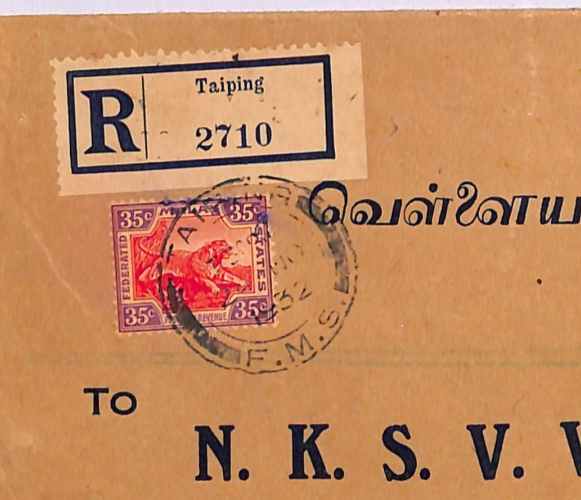 MALAYA FMS TIGERS Cover Taiping Registered Perak INDIA Kilasavalpatti 1932 WB121