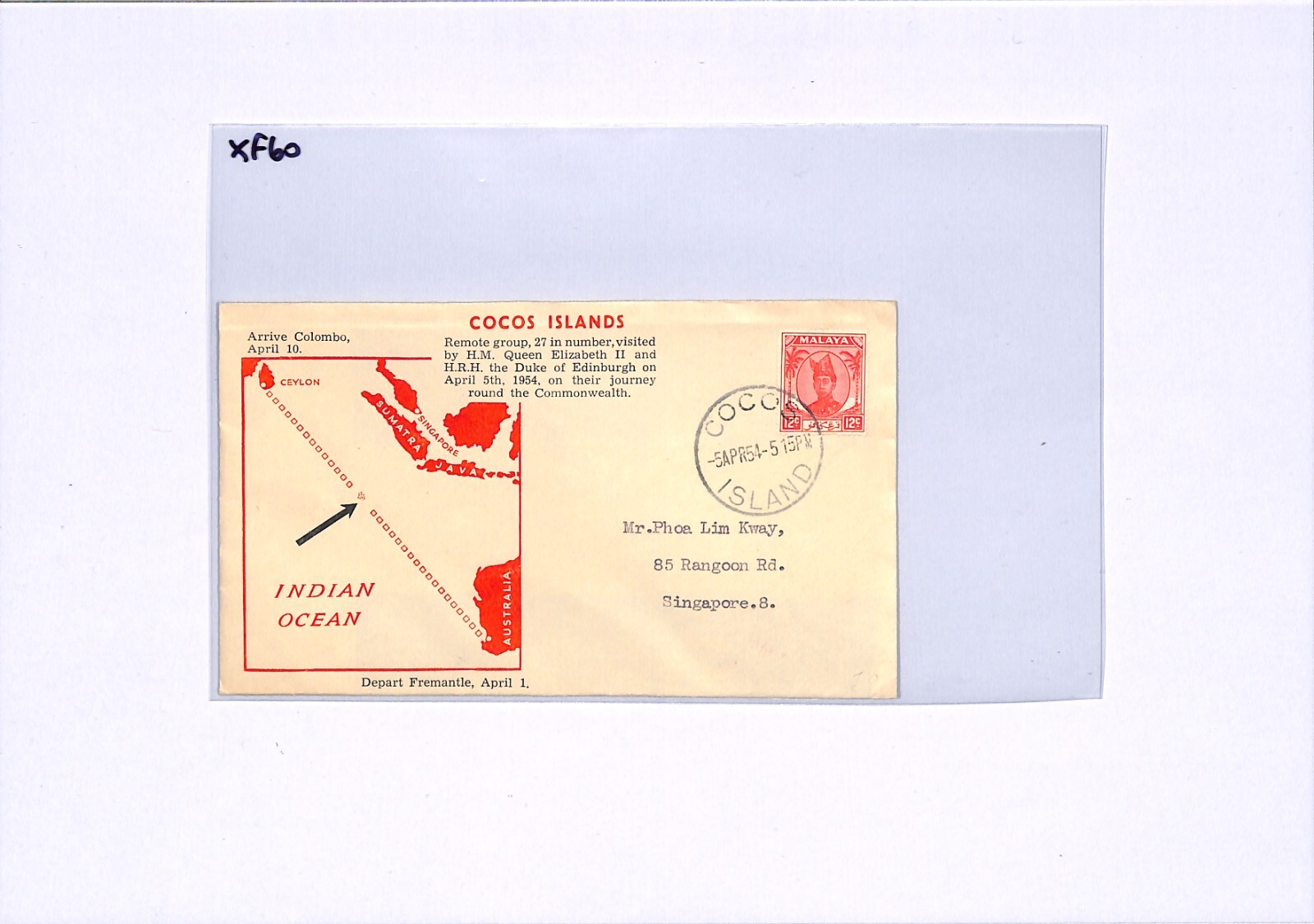 MALAYA USED *COCOS ISLANDS* Air Mail Cover 1954 Singapore FLIGHT MAP Illustrated XF60