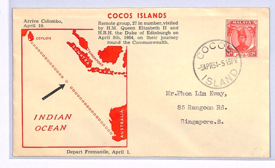 MALAYA USED *COCOS ISLANDS* Air Cover 1954 Singapore FLIGHT MAP Illustrated XF60