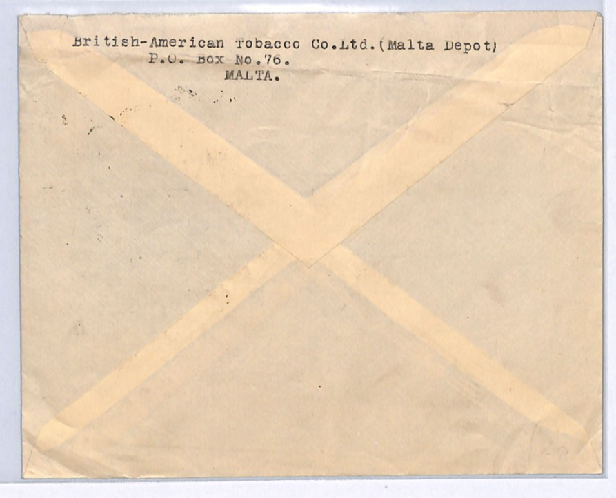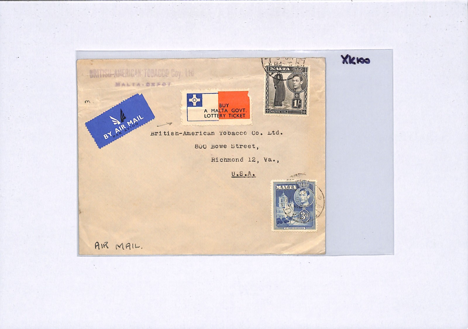 MALTA KGVI Cover *GOVT LOTTERY TICKET* Label 1948 Air Richmond VA TOBACCO XK100