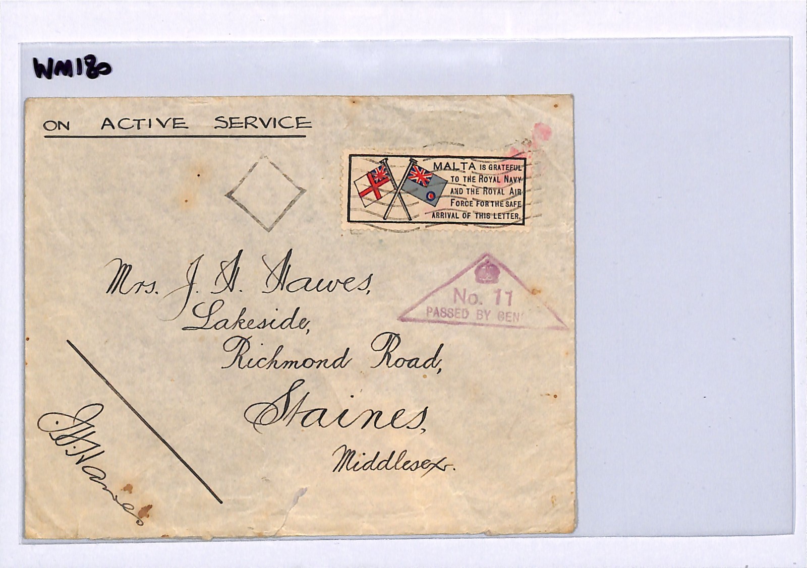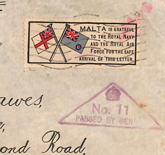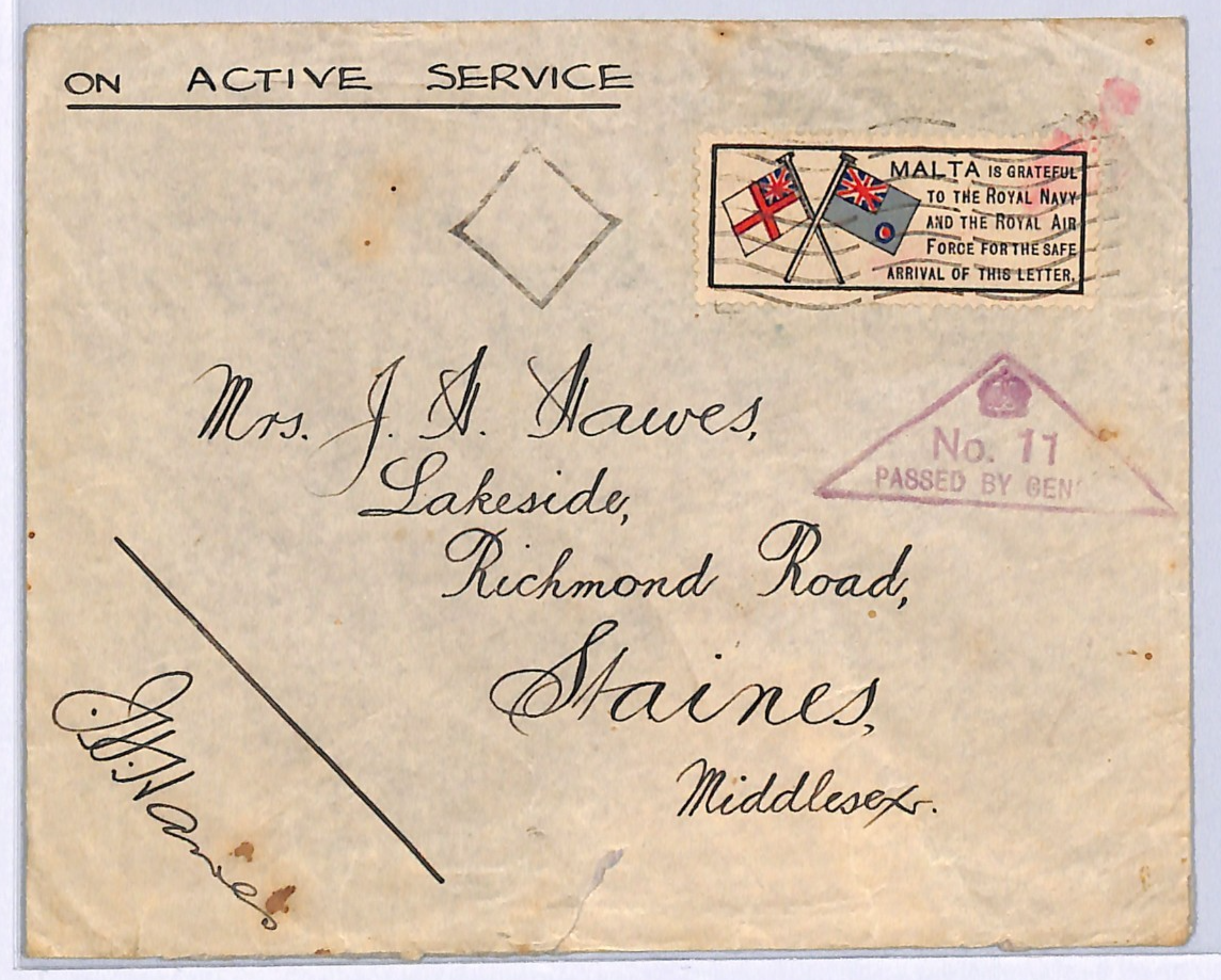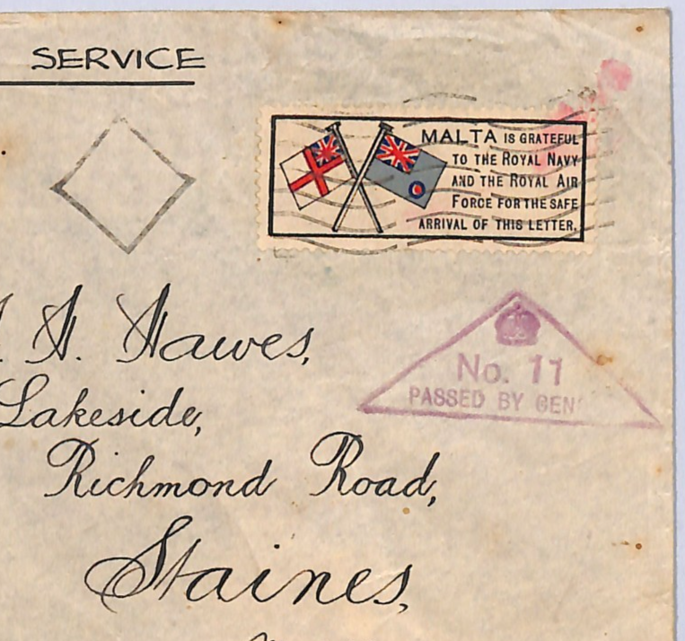 MALTA WW2 Censor Cover *PATRIOTIC LABEL* Tied FLAGS ROYAL NAVY/RAF Staines WM180