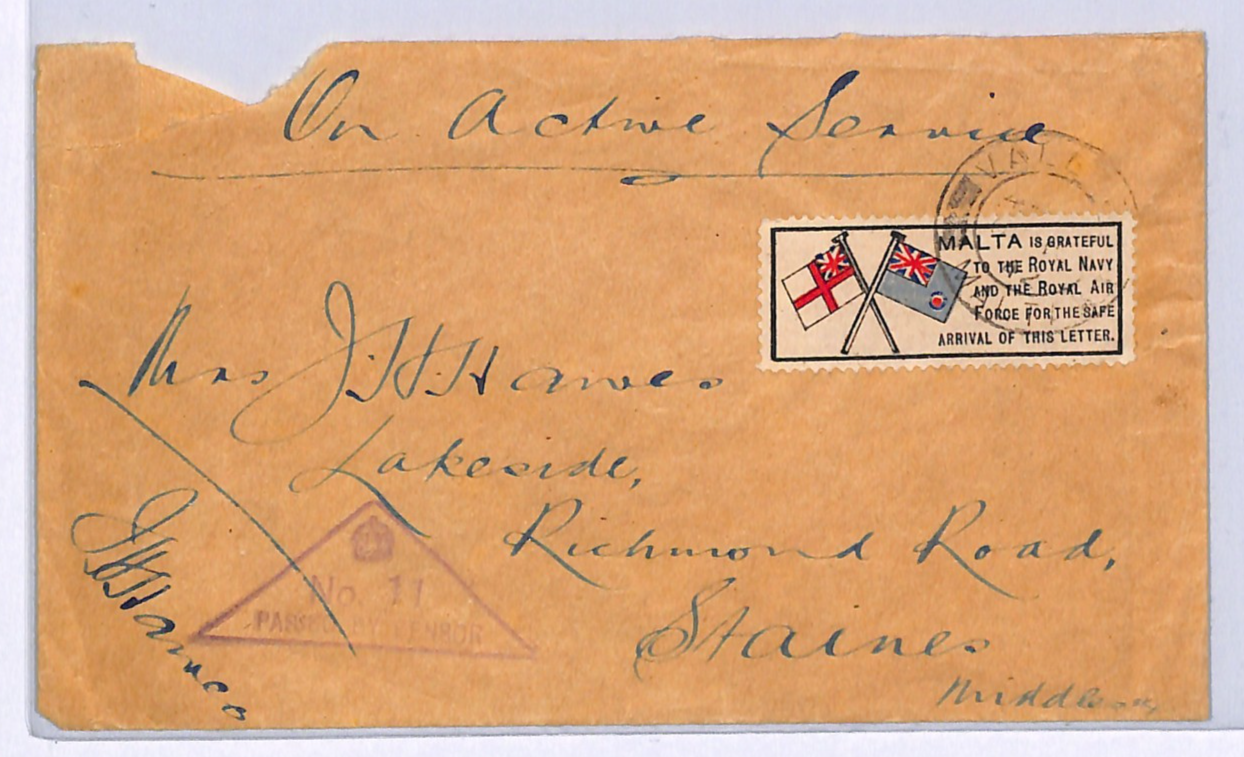 VERY SCARCE WITH *MALTA IS GRATEFUL* PATRIOTIC LABEL VERY WELL-TIED by Malta CDS. Opening fault otherwise Very Fine. Overall Good/VG for an item of this type & period. Please look at all the scans to help form your own opinion (WAF).