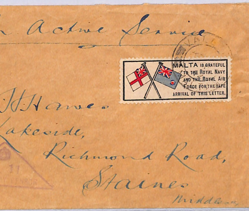 MALTA WW2 Forces Cover ROYAL NAVY/RAF Label GB Middx Staines 1942 WM162
