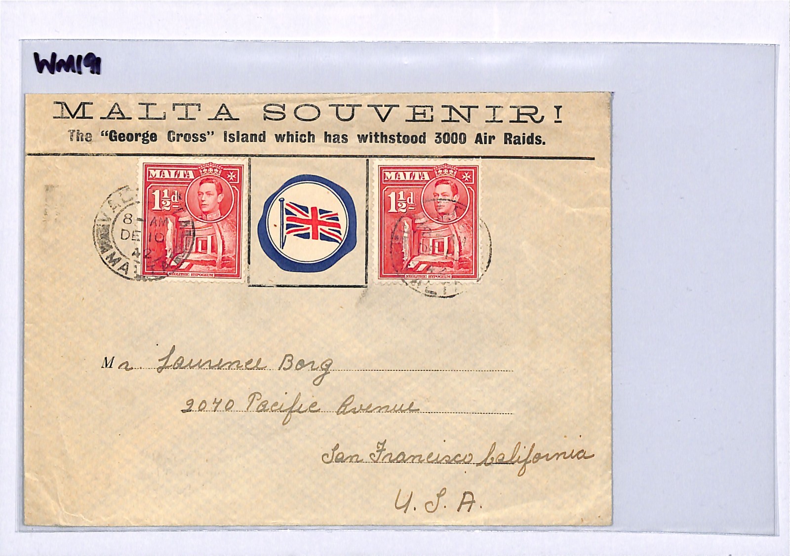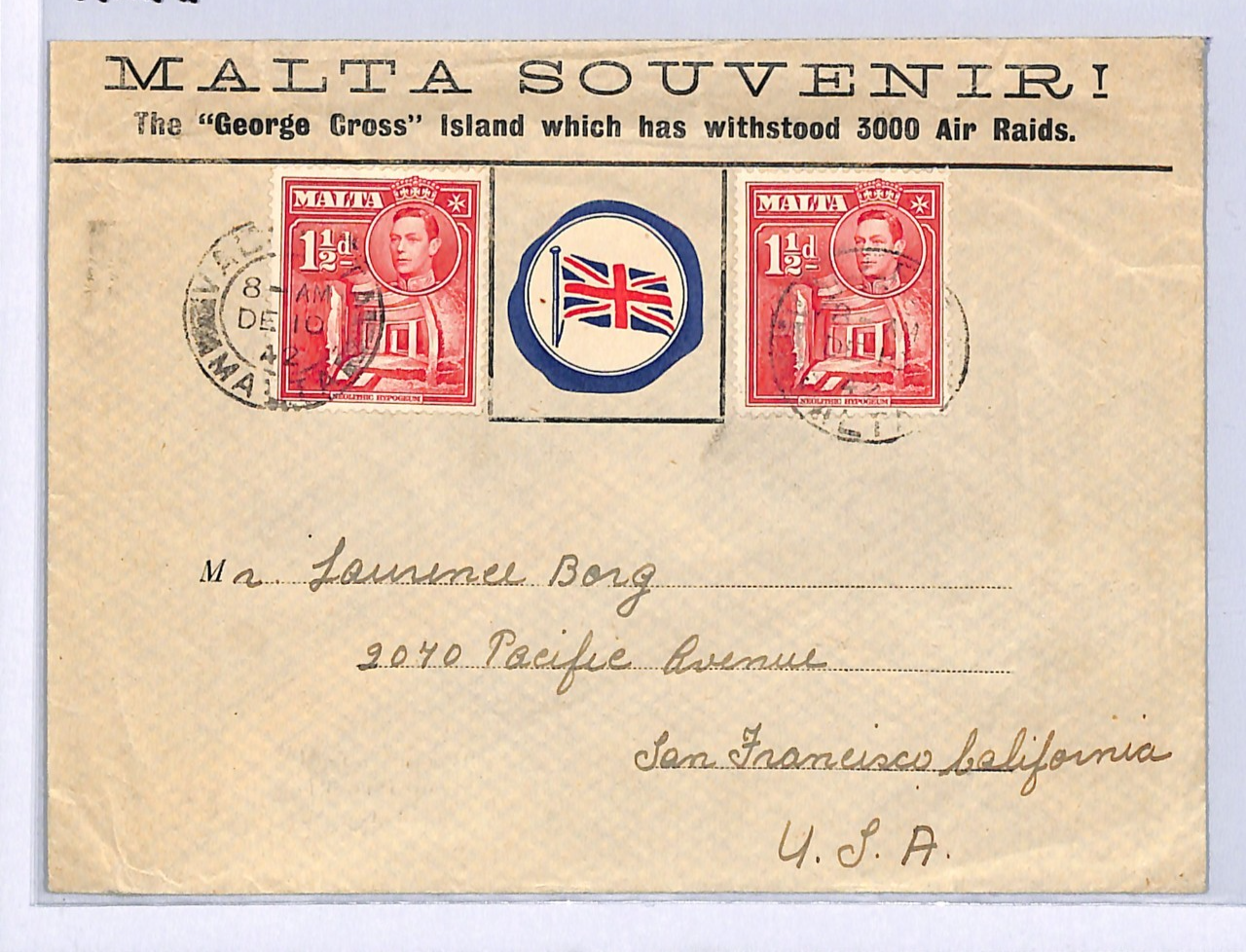 MALTA WW2 Cover Valetta GEORGE CROSS USA San Francisco 1942{samwells}WM191
