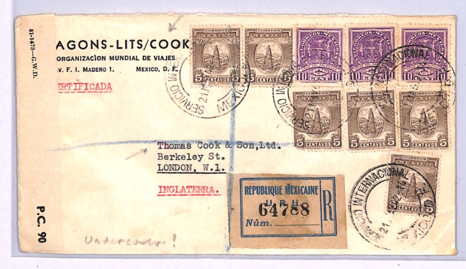 MEXICO WW2 Cover UNDERCOVER ADDRESS *Wagons-Lits* THOS COOK 1942 London XA238
