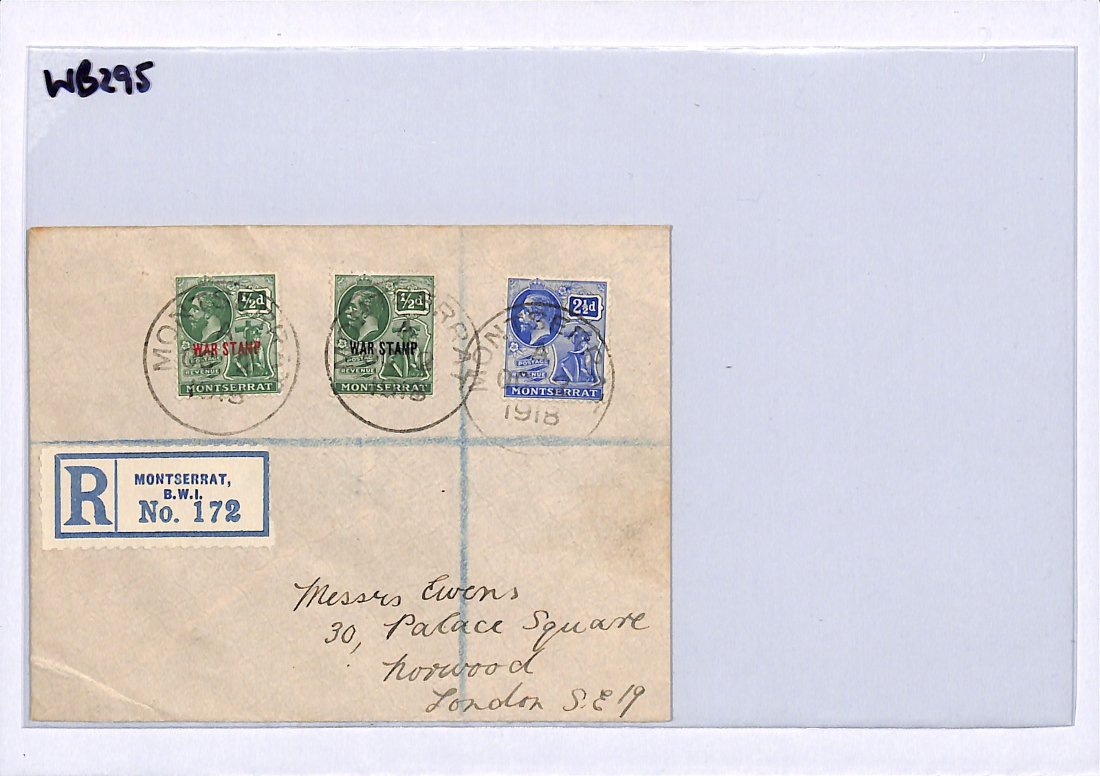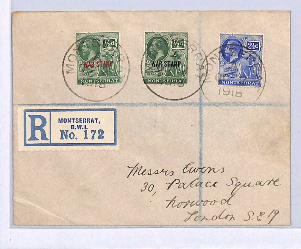 MONTSERRAT BWI Cover WW1 KGV *WAR STAMP* Overprints Registered 1918 London WB295