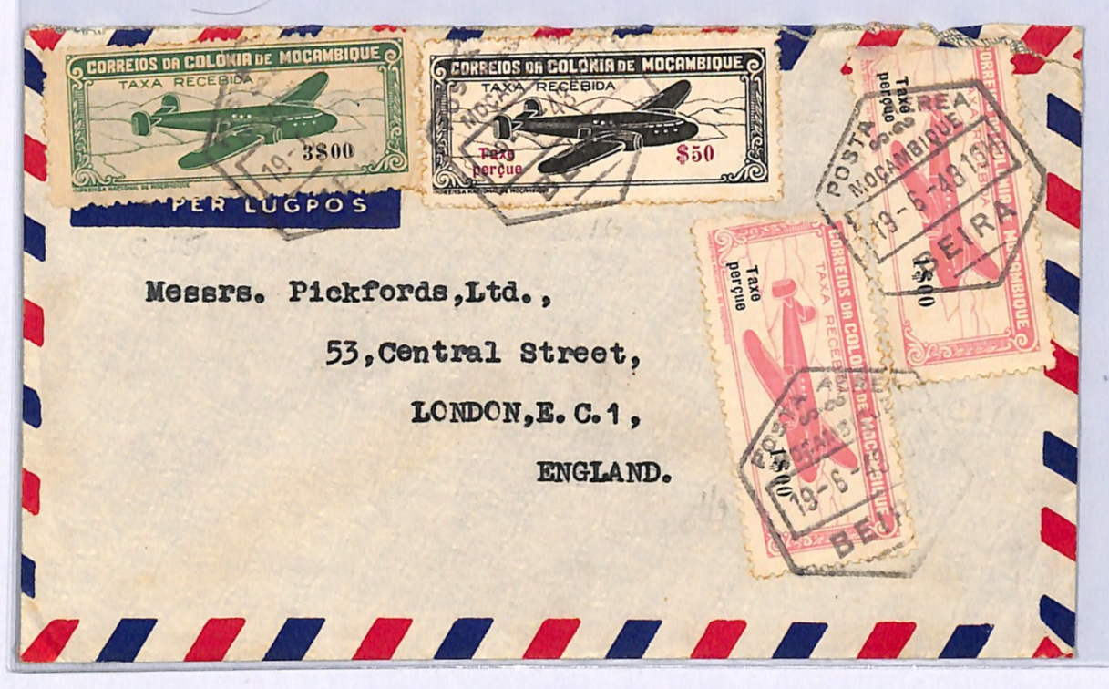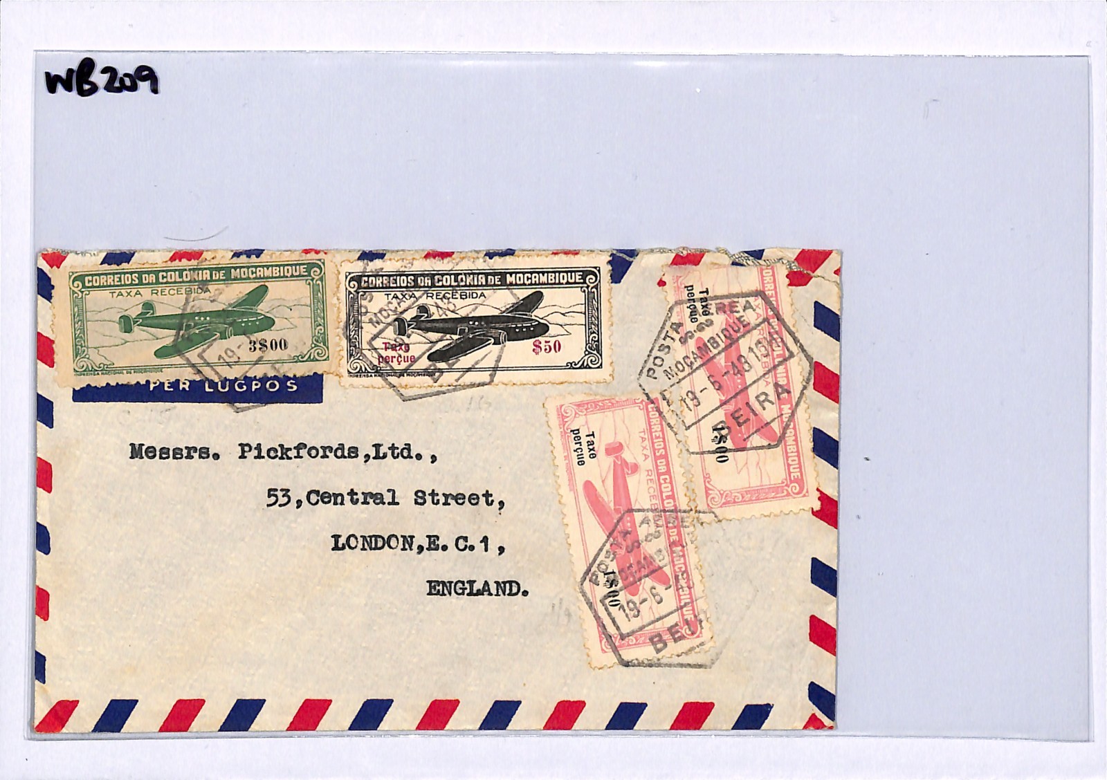 MOZAMBIQUE Air Mail Cover Beira TAXE PERCUE GB London 1948 Portugal Cols WB209