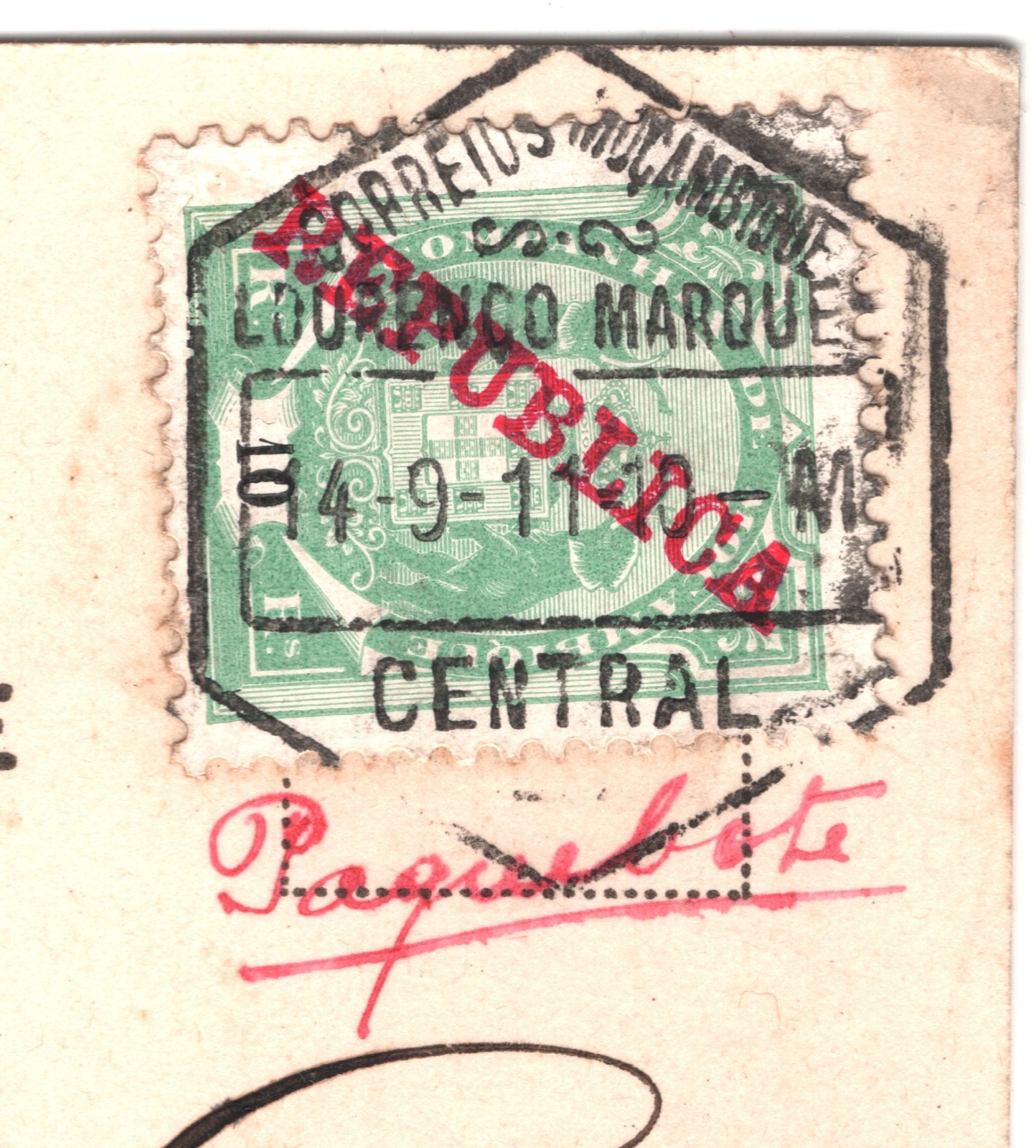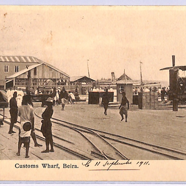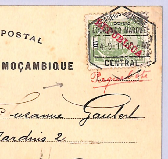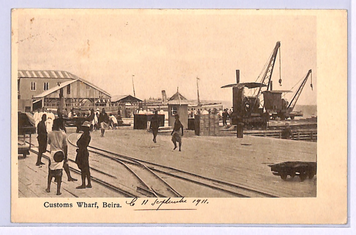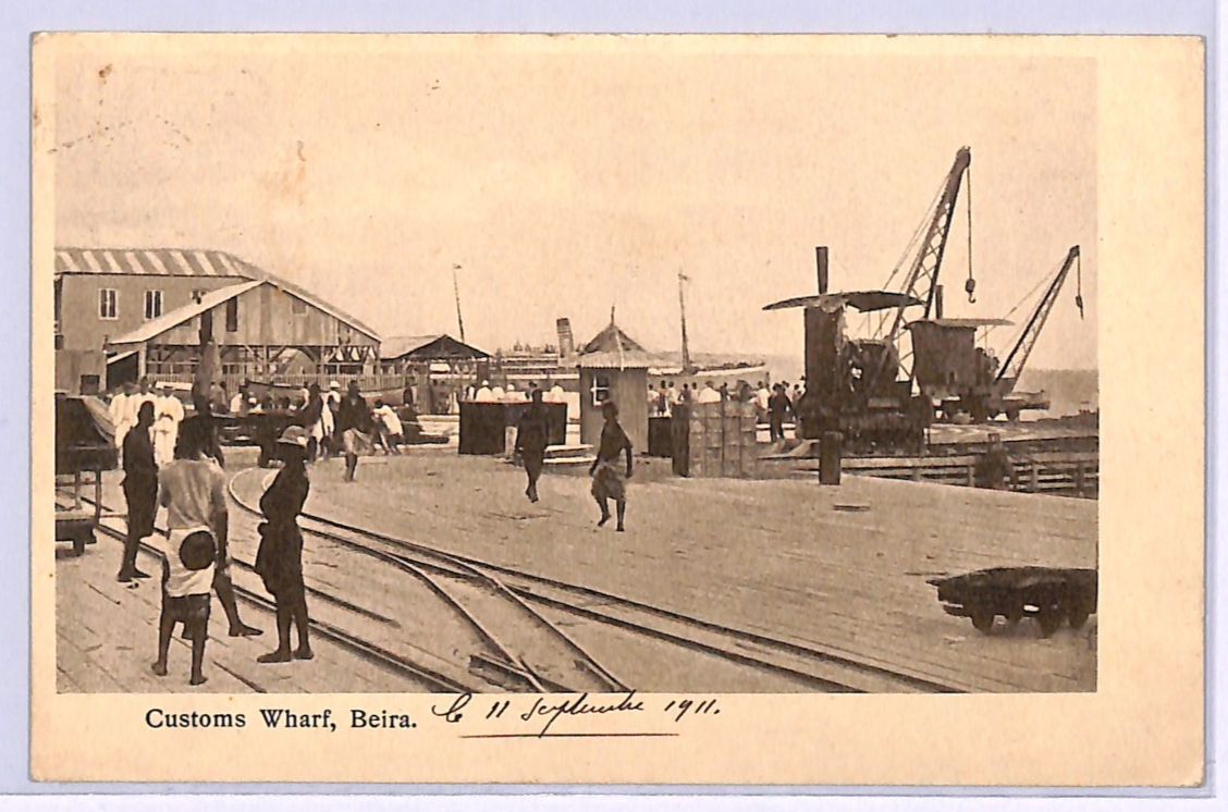RARE MANUSCRIPT *PAQUEBOT* ENDORSEMENT in red ink, below stamp. PPC of Customs Wharf, Beira. Fine for an item of this type & period. Please look at all the scans to help form your own opinion (WAF).