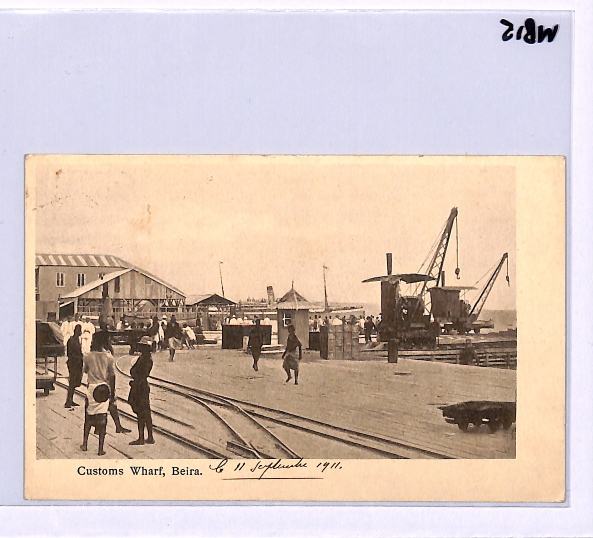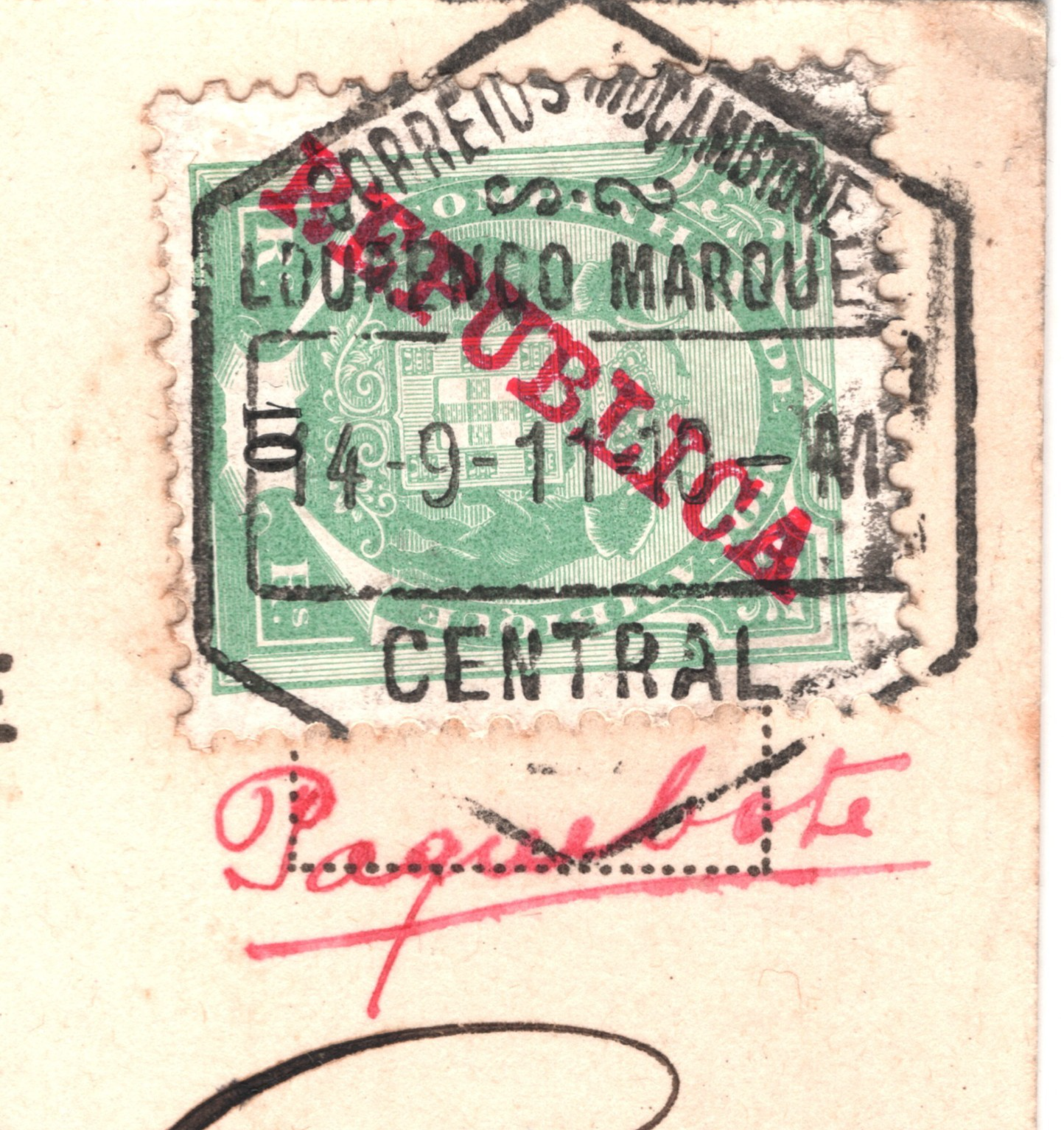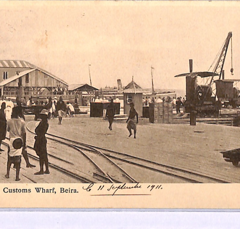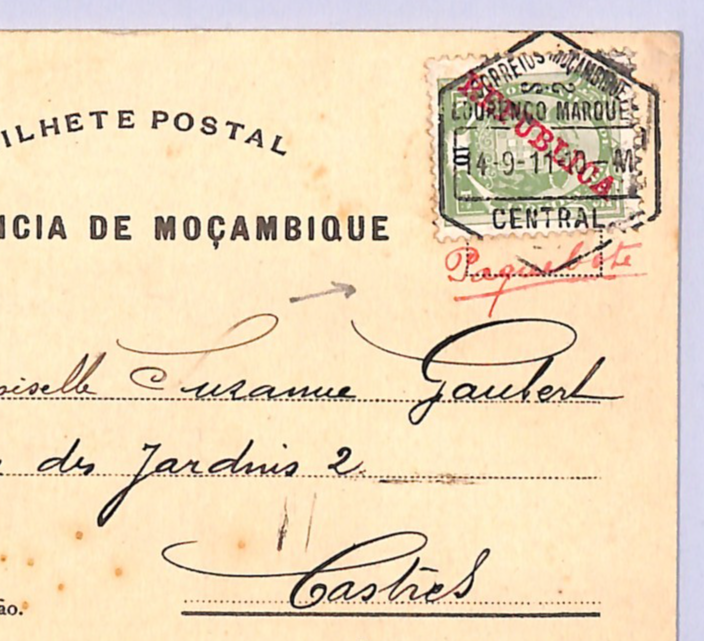 RARE MANUSCRIPT *PAQUEBOT* ENDORSEMENT in red ink, below stamp. PPC of Customs Wharf, Beira. Fine for an item of this type & period. Please look at all the scans to help form your own opinion (WAF).