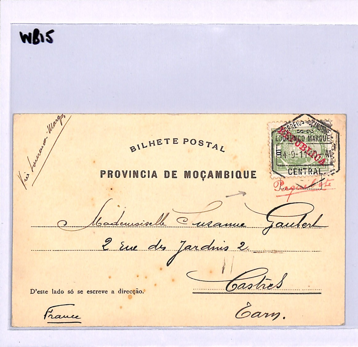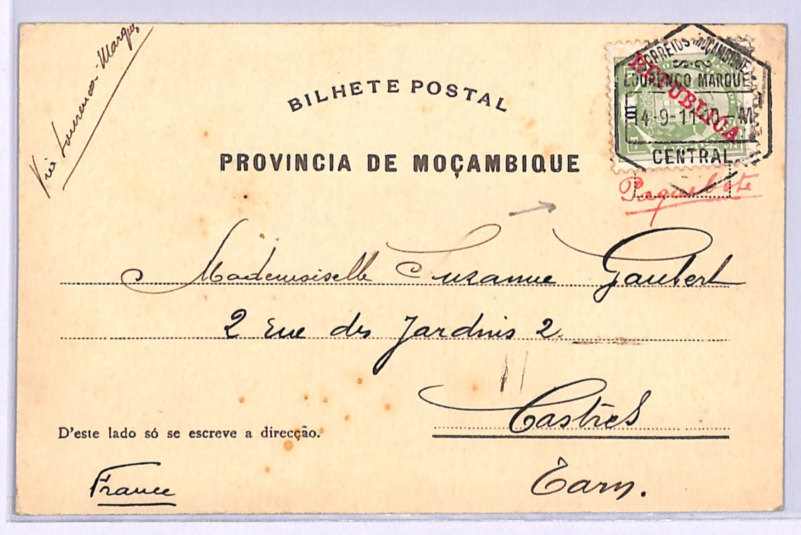 MOZAMBIQUE LOURENCO MARQUES Card PAQUEBOT Central France Castries 1911 WB15