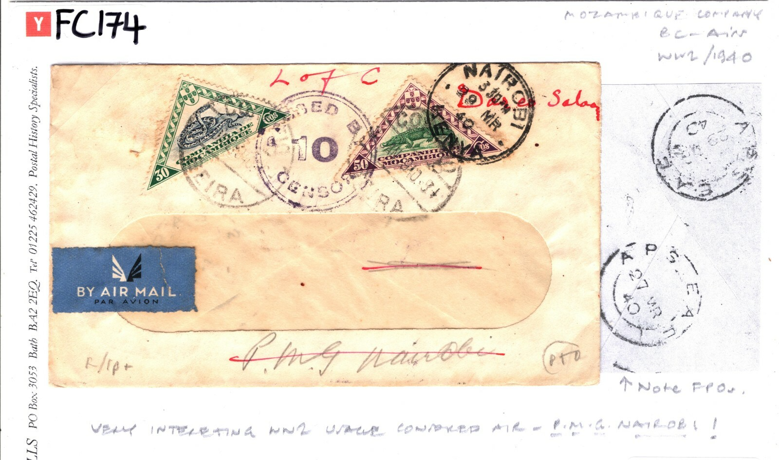 Portuguese Cols MOZAMBIQUE Company WW2 Cover Beira KENYA Nairobi Military FPO 1940 FC174