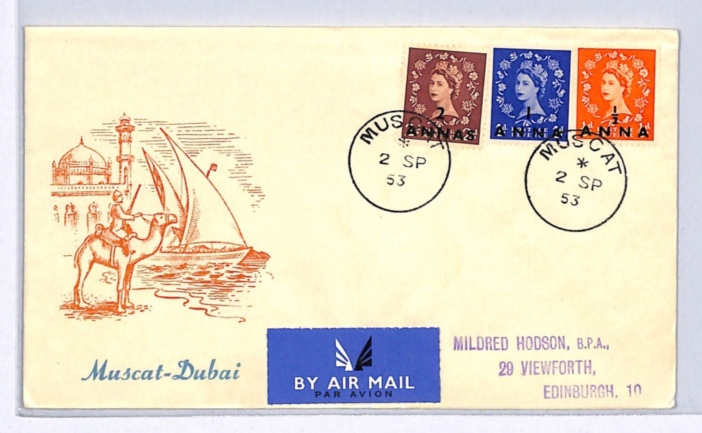 Gulf EASTERN ARABIA GB Overprint QEII WILDINGS 1953 FDC Illustrated *MUSCAT-DUBAI* Vignette First Day Cover (OMAN) Muscat CDS WY233