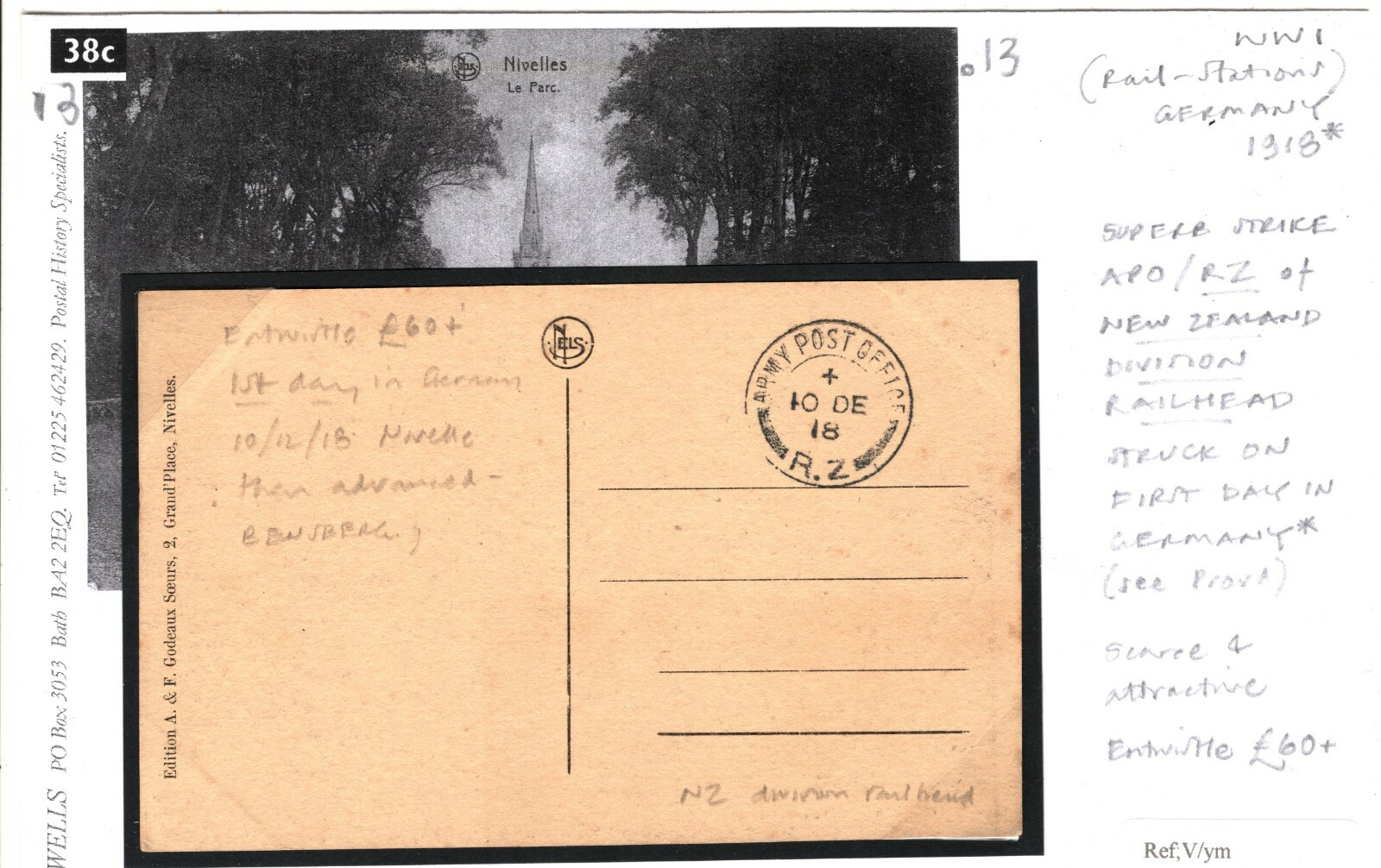 NEW ZEALAND Post-WW1 *APO/RZ* Division Railhead First Day in GERMANY 1918 38c.13