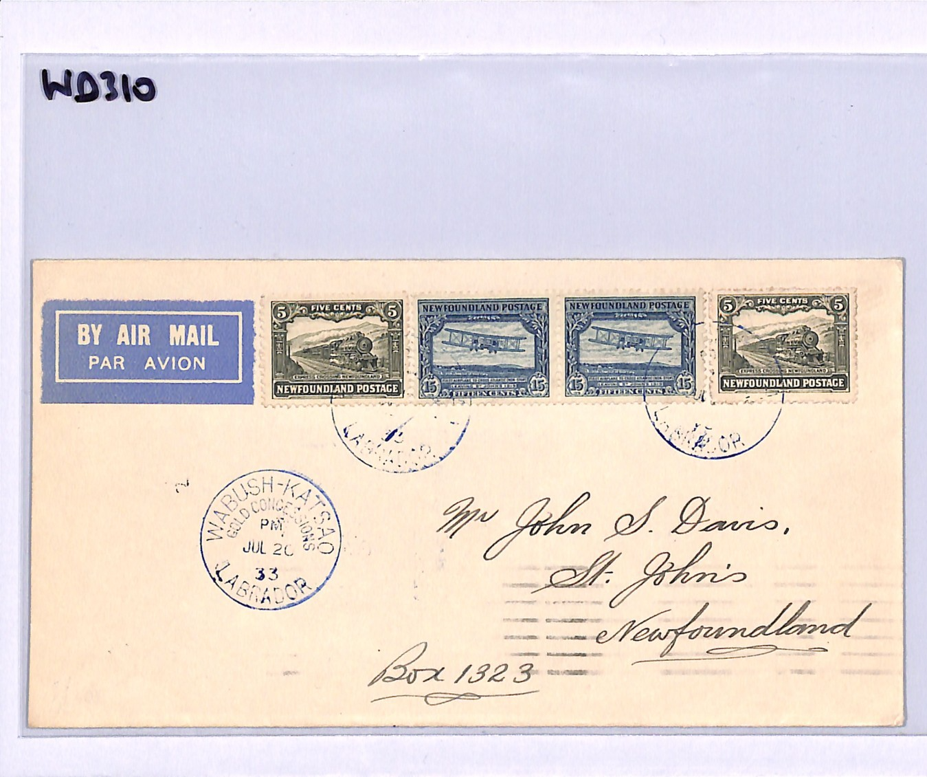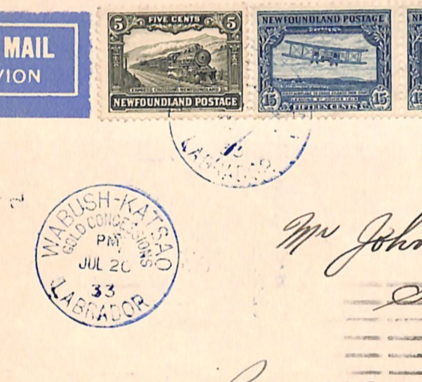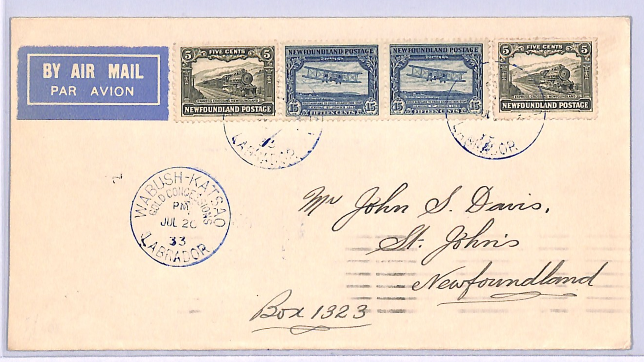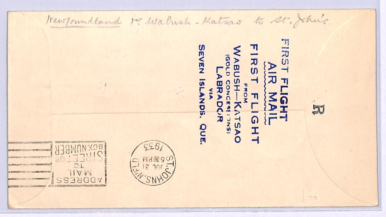NEWFOUNDLAND Air Mail FIRST FLIGHT Cover Wabush-Katsao Blue CDS 1933 Canada Quebec WD310