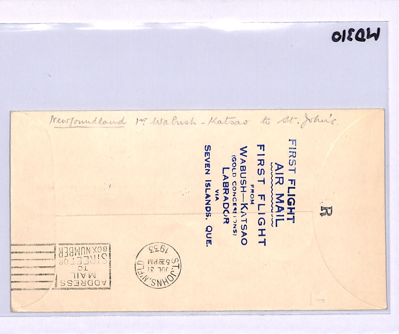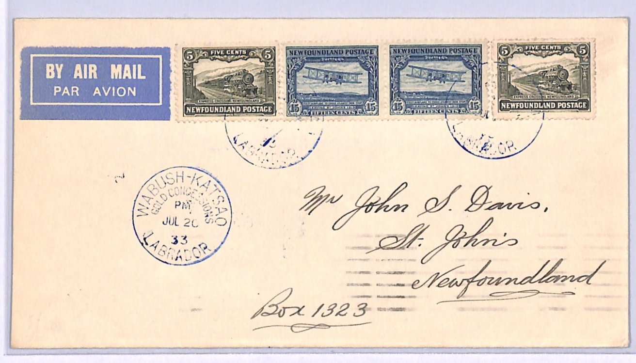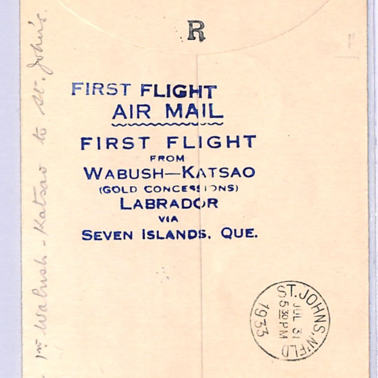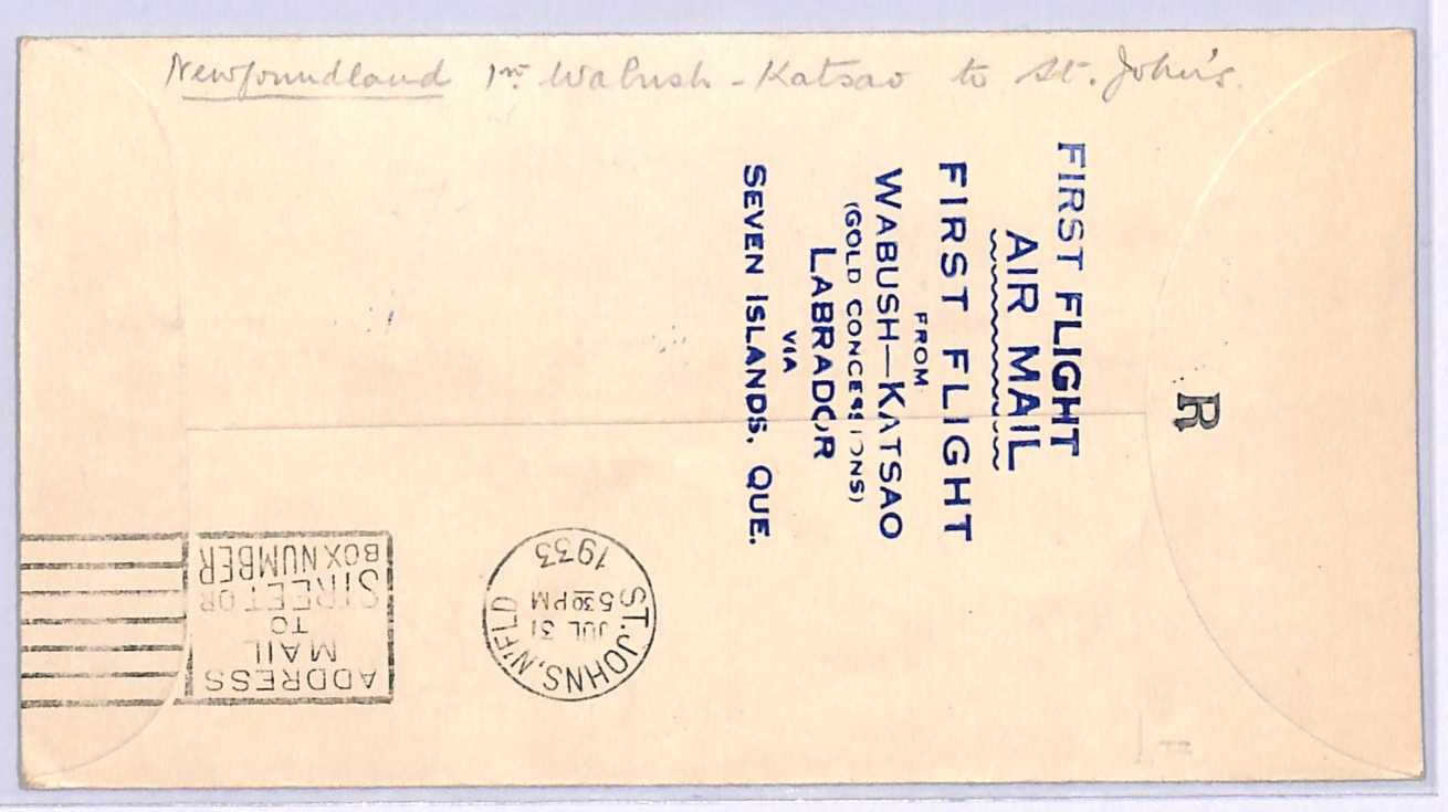 NEWFOUNDLAND Air Mail FIRST FLIGHT Cover Wabush-Katsao Blue CDS 1933 Canada Quebec WD310