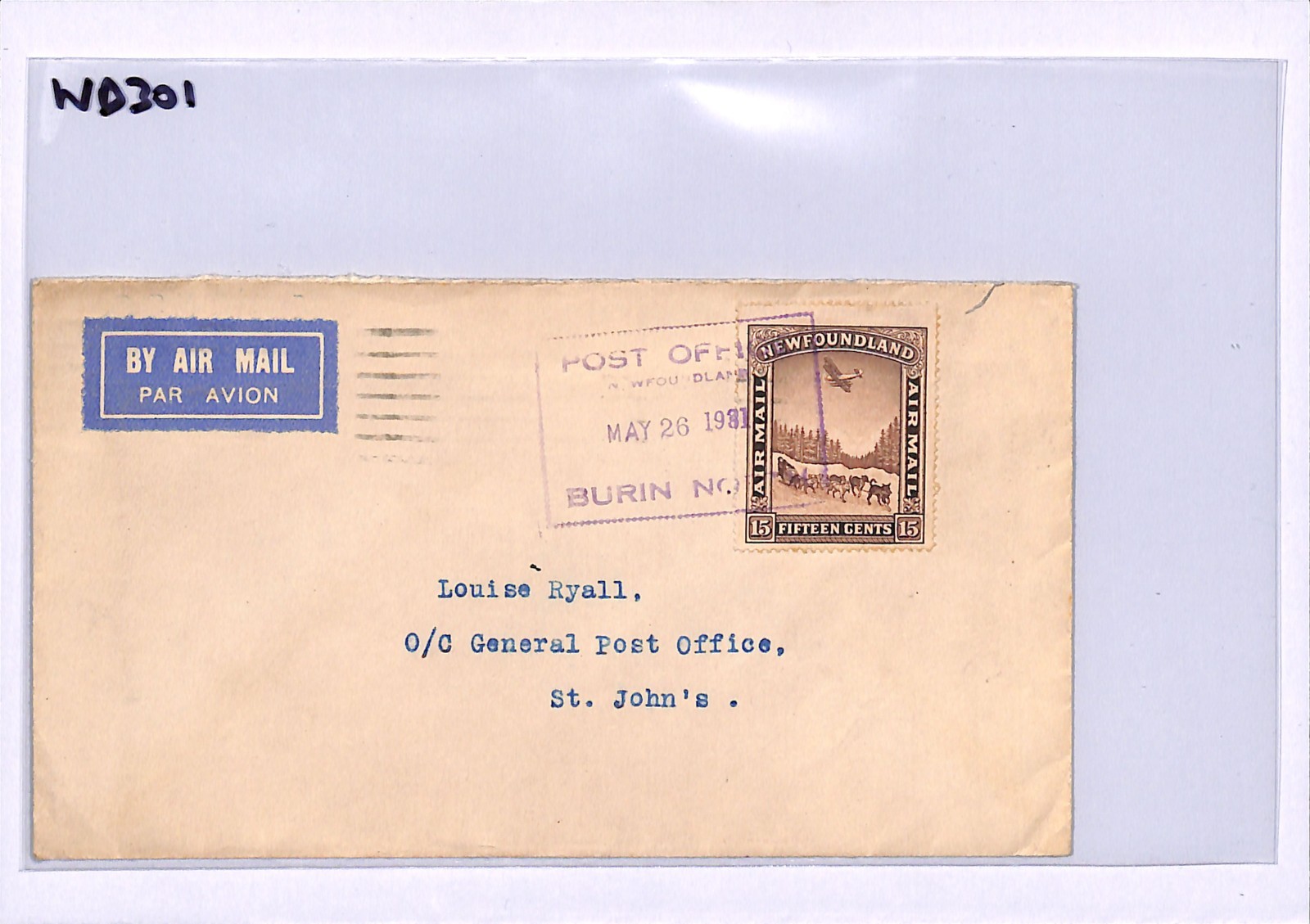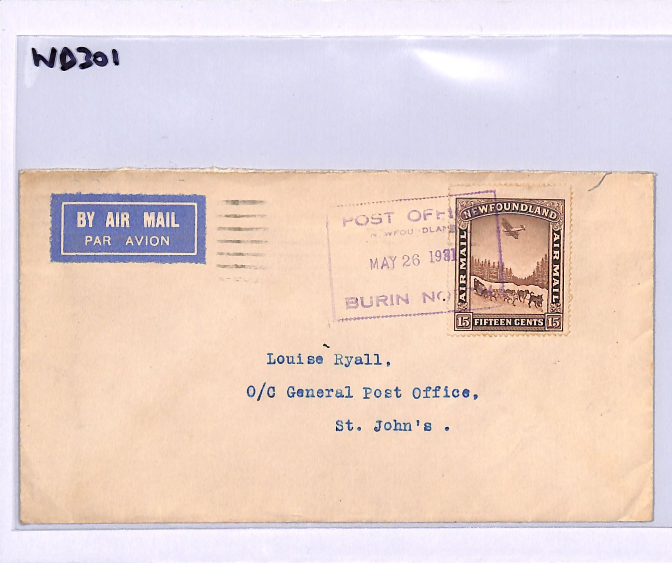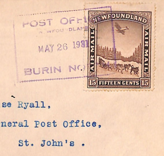 NEWFOUNDLAND 15c Air Mail Cover *BURIN* 1931 FLIGHT St Johns Canada WD301