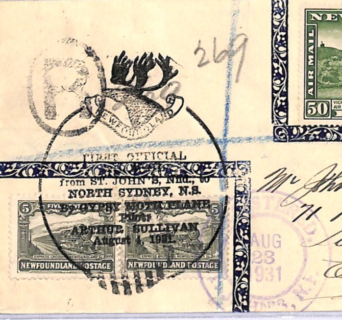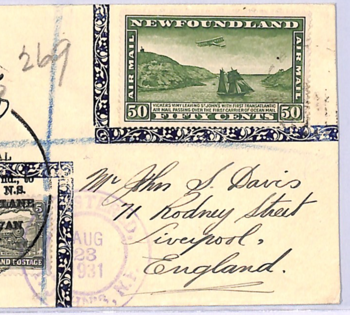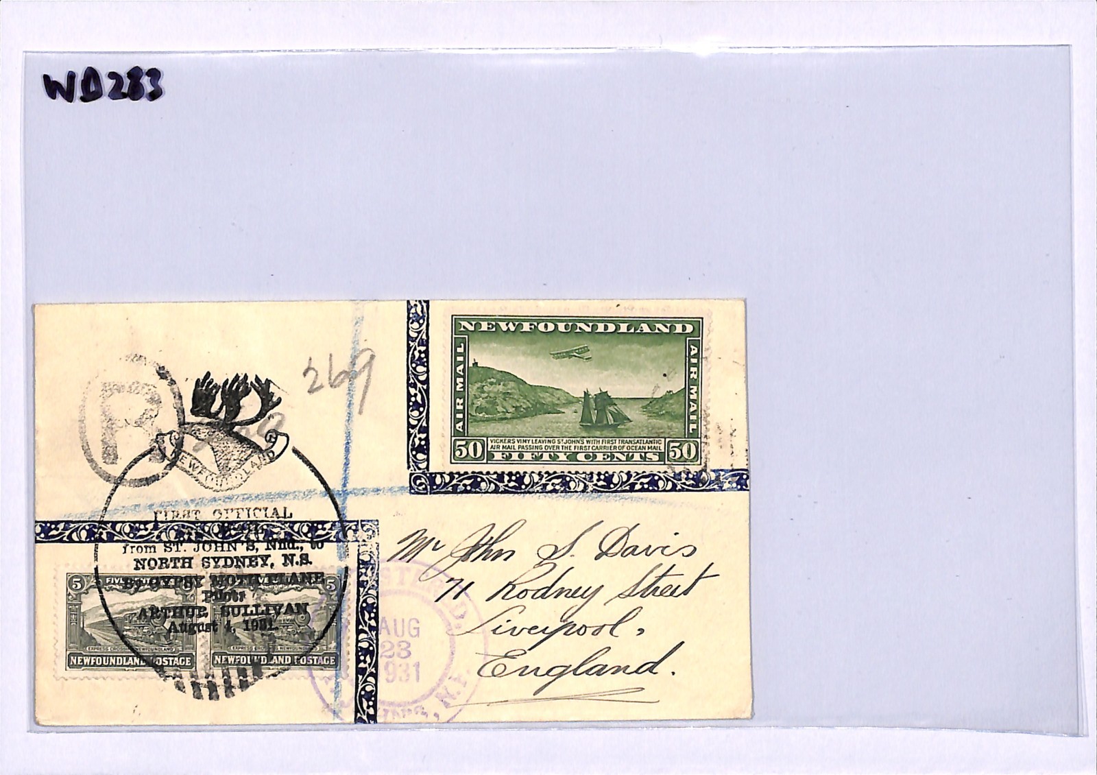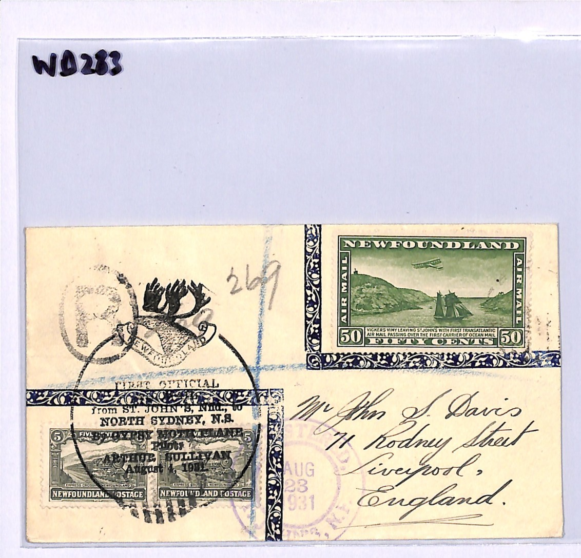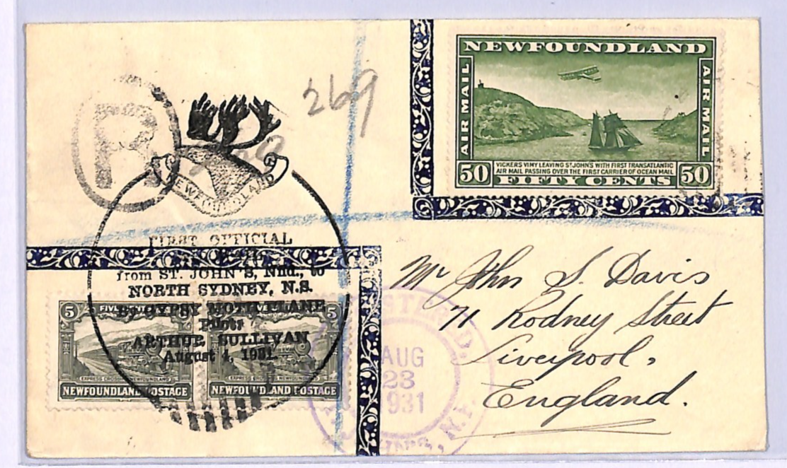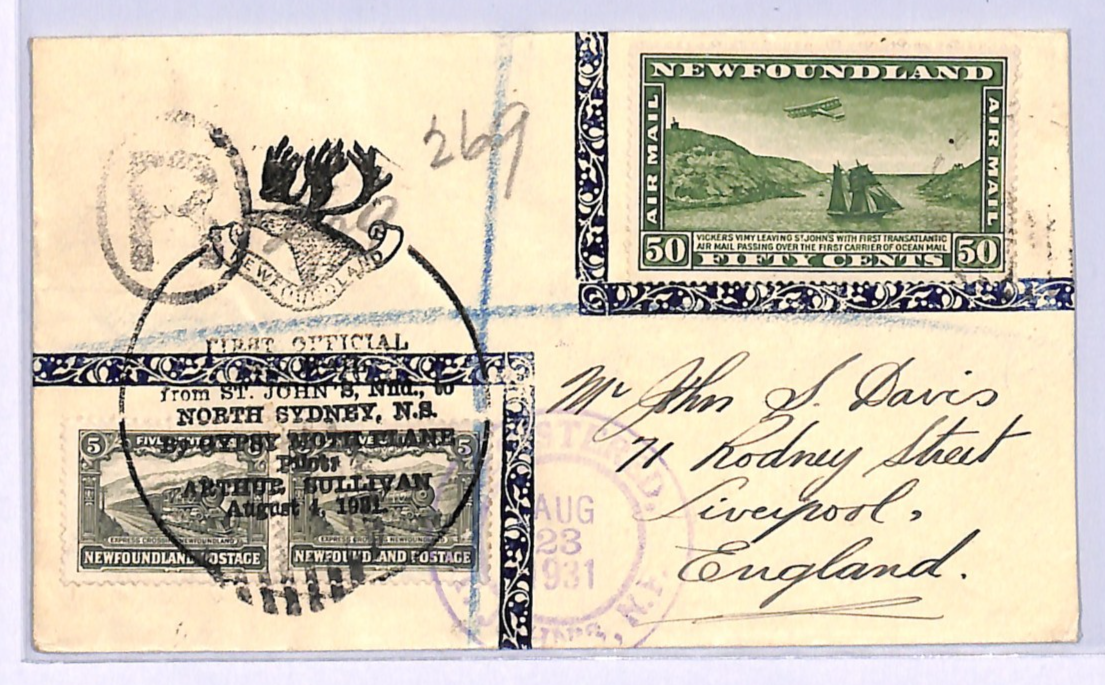 NEWFOUNDLAND Air Mail FIRST FLIGHT GYPSY MOTH St Johns-North Sydney Cover TRANSATLANTIC GB Liverpool 1931 WD283