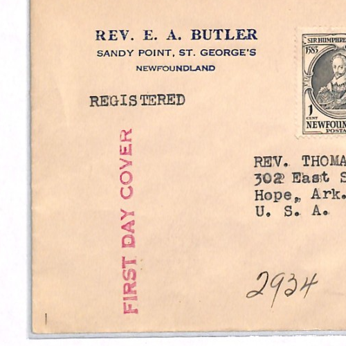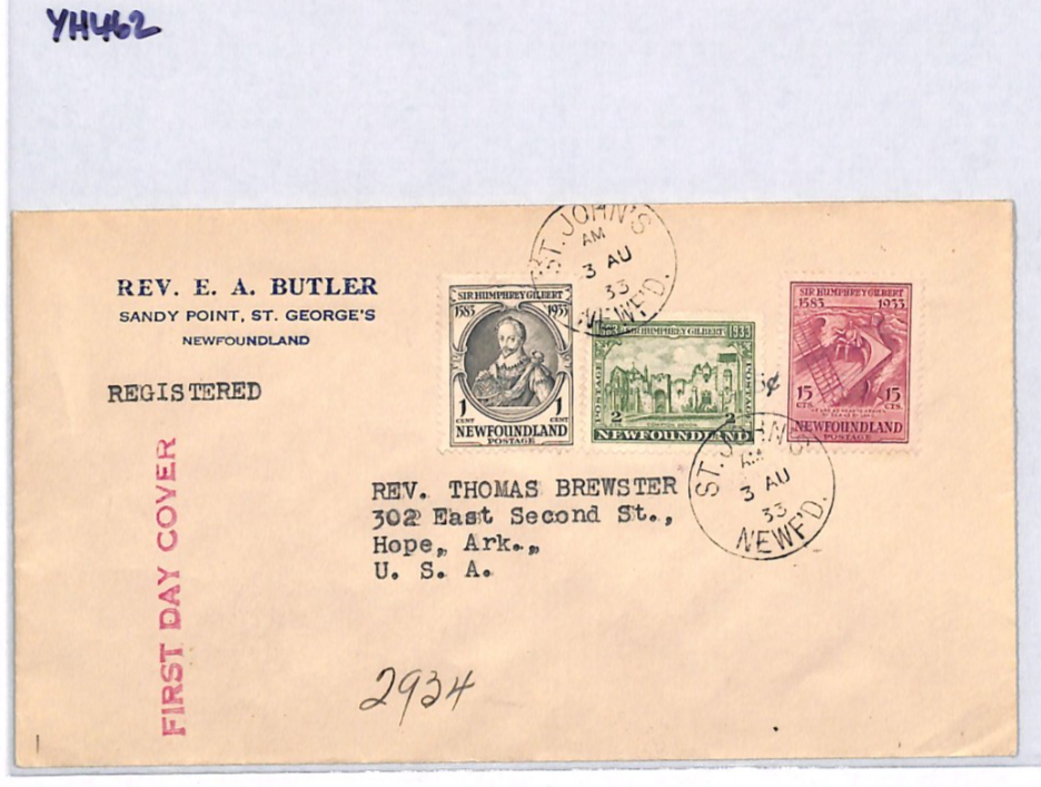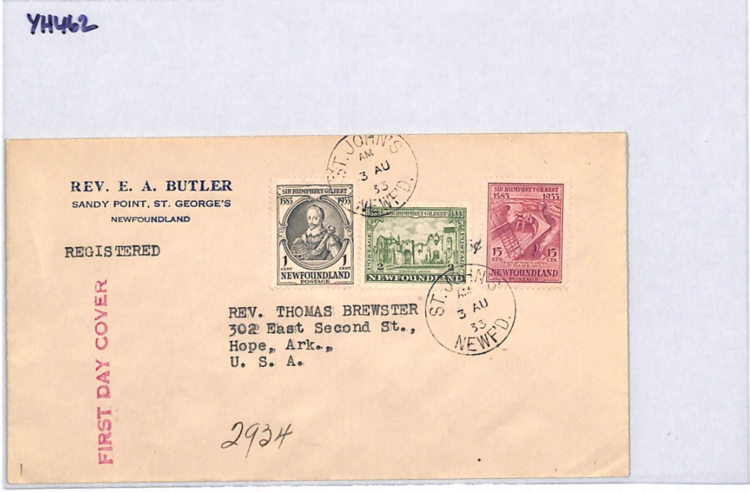 NEWFOUNDLAND Canada 1933 FDC *HUMPHREY GILBERT* 15c 2c 1c Registered First Day Cover YH462