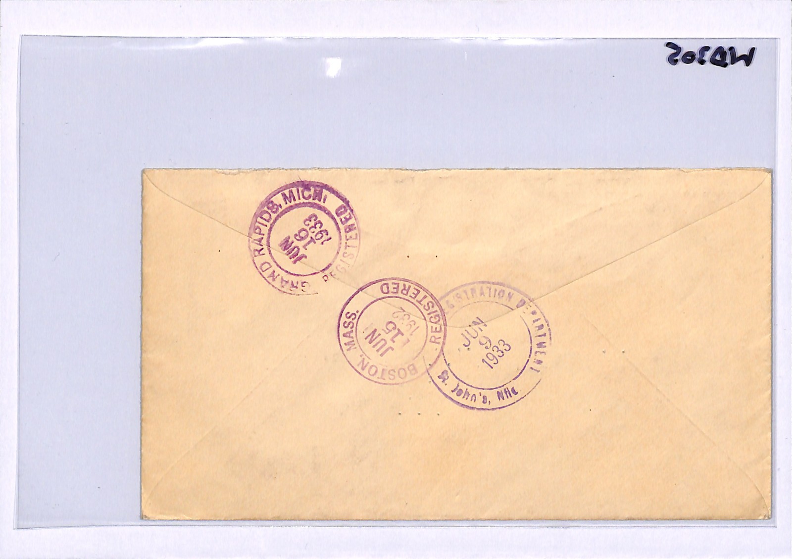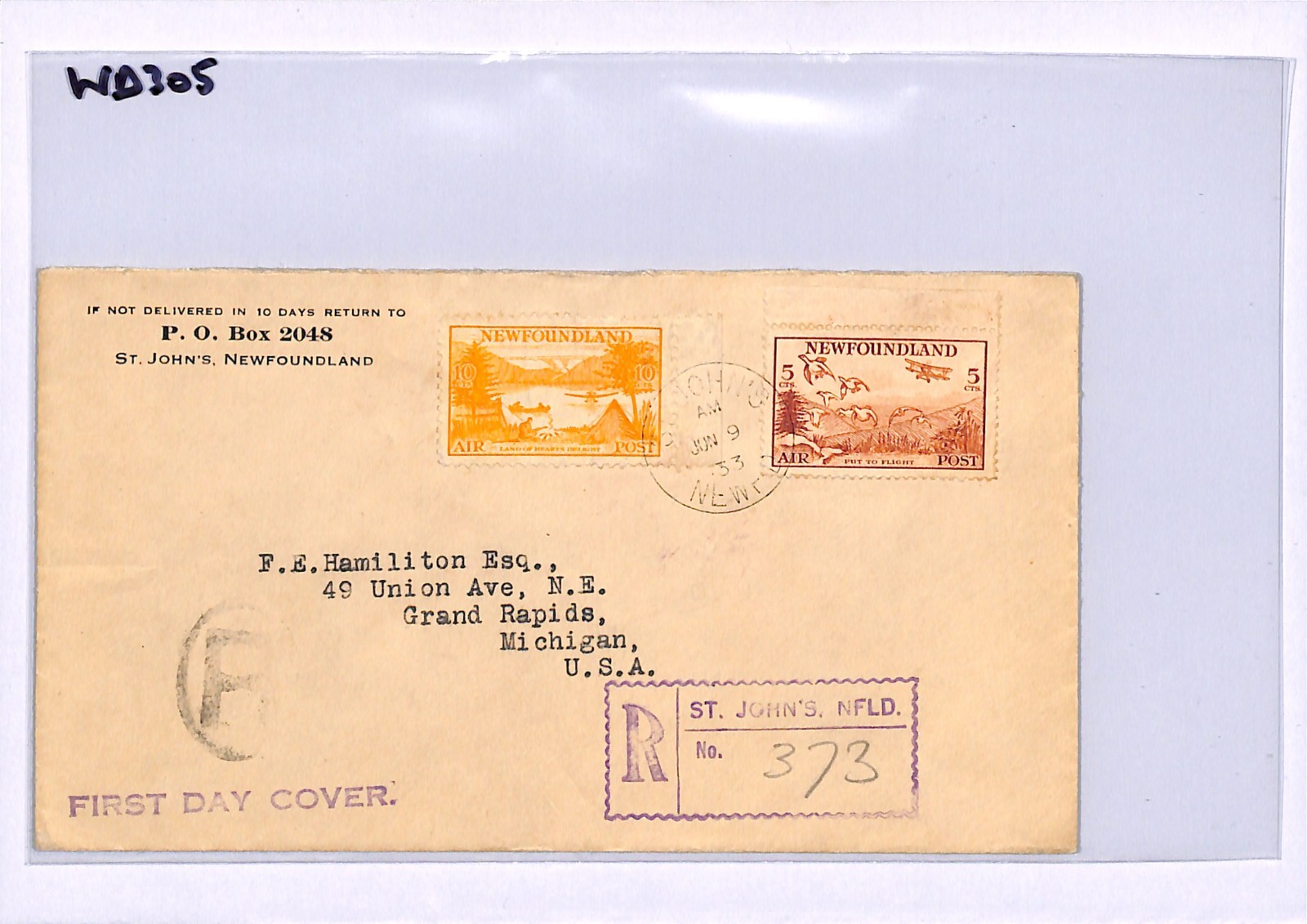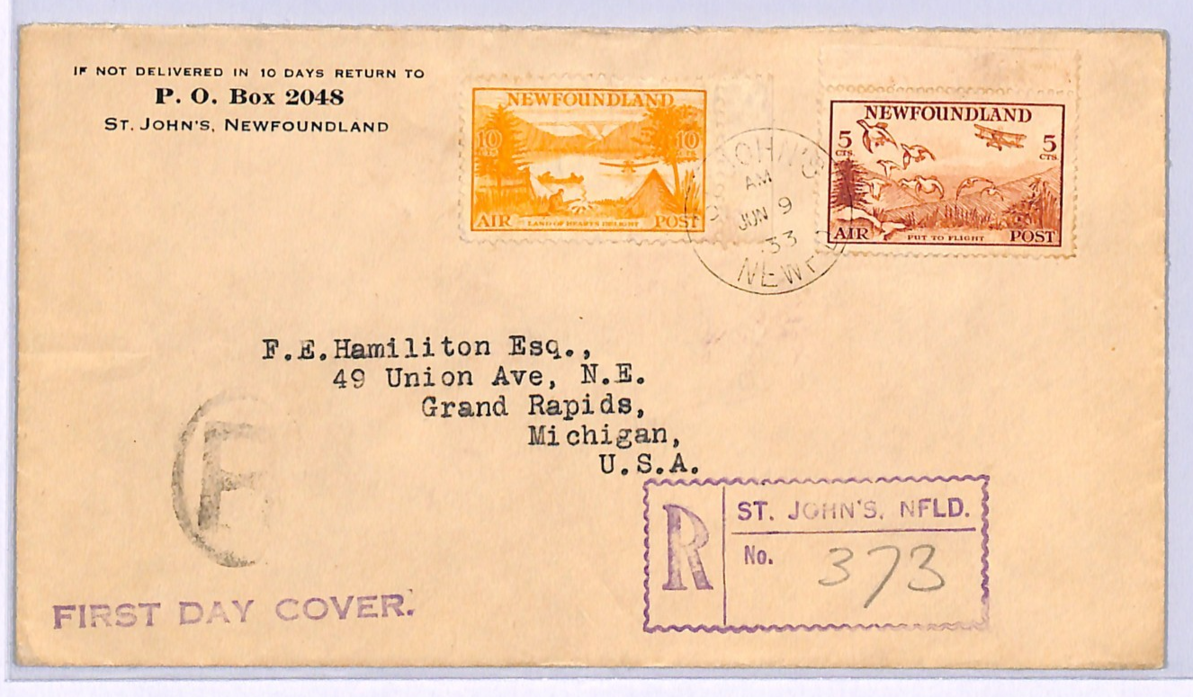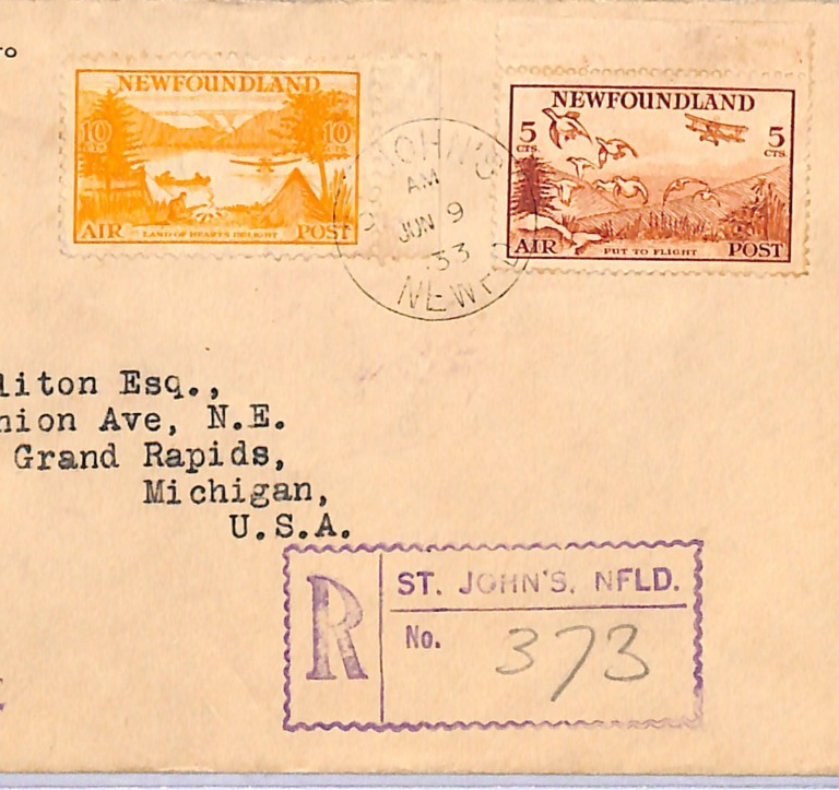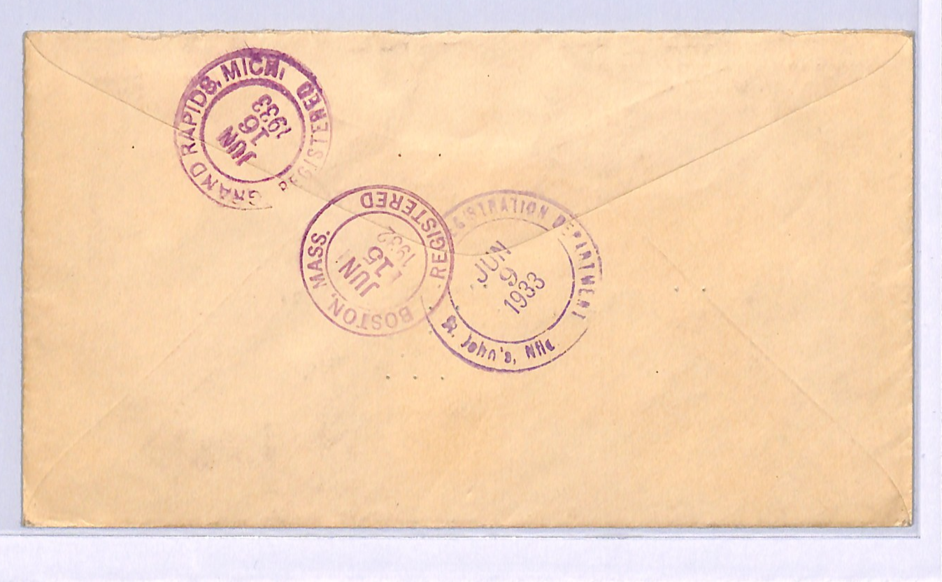 NEWFOUNDLAND KGV FDC 1933 Air Mail St Johns Registered USA Grand Rapids WD305