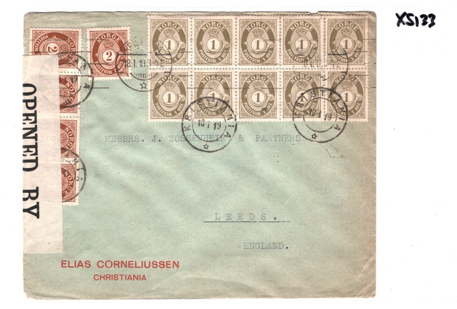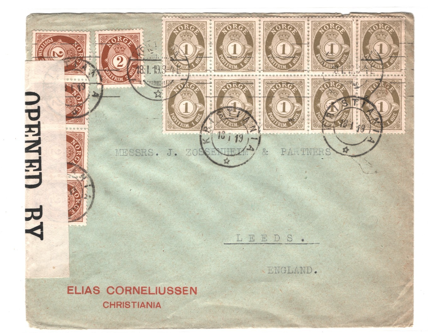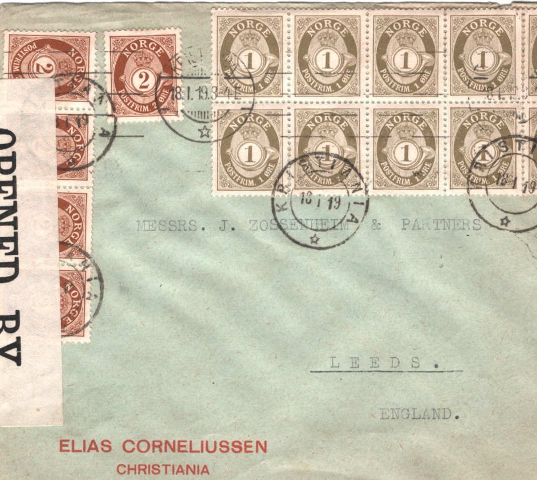 NORWAY Cover Kristiania Block Franking GB (WW1) CENSOR Leeds 1919{samwells}XS133